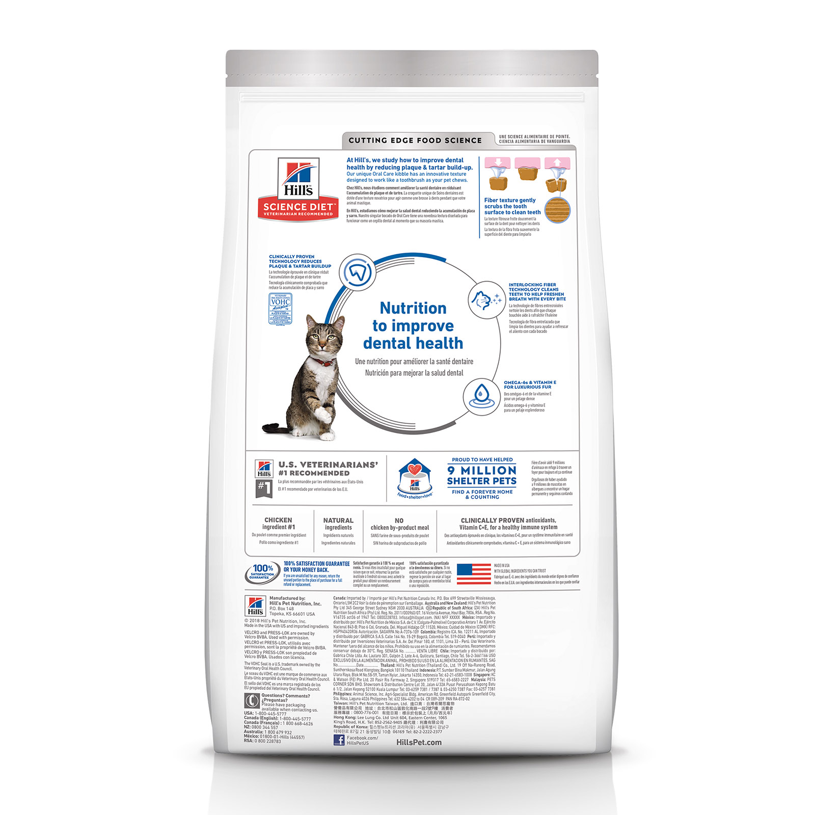 Hills Science Diet Feline Oral Care dry cat food provides precisely balanced nutrition for dental and complete health. Good dental health for cats is vital to their overall health and wellbeing. Hill's Science Diet Oral Care dry cat food provides precisely balanced nutrition to improve dental health in your grown cat using a clinically proven kibble technology. This cat food made with natural ingredients uses an interlocking fibre technology to scrub and clean cat teeth, freshening breath with every bite. Plus, because every cat wants healthy fur, omega-6s and vitamin E are added to nourish the skin and coat.