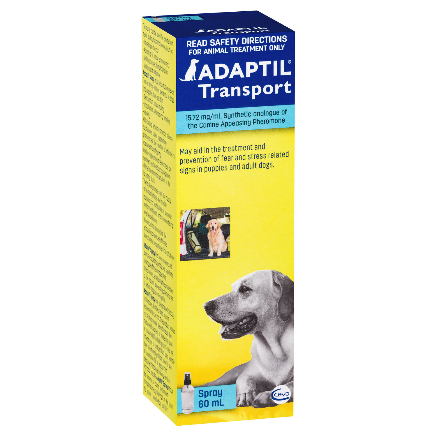 Adaptil Transport Spray for anxiety contains a dog appeasing pheromone (DAP) which can be used in your dogs environment to help promote feelings of calm and well-being. Adaptil Spray can be sprayed directly on bedding, inside crates, indoor kennels or in the car.