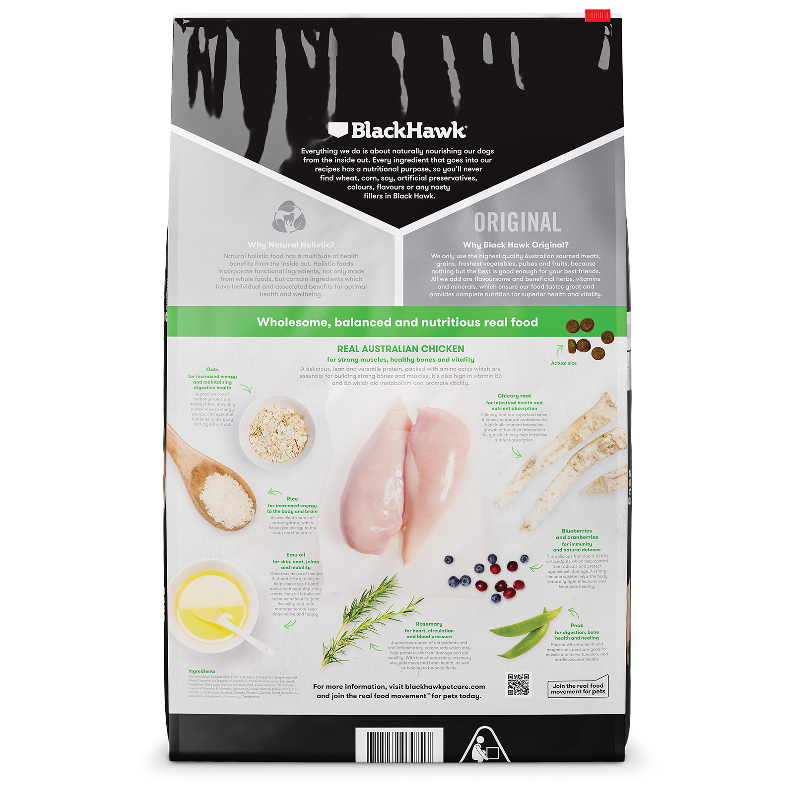 Black Hawk Large Breed Chicken and Rice contains a delicious, lean and highly digestible chicken-based protein source, packed with amino acids which are essential for building strong bones and muscles. The recipe is formulated specifically with ingredients that matter, like Australian grown oats, and rice for a boost of energy to the body and brain, blueberries and cranberries as natural antioxidants that can help control free radicals, as well as natural prebiotics to support digestion and gut health. This recipe also contains emu oil which may support joints, providing complete and balanced nutrition for your pet. Larger sized kibble for bigger mouths, suited to large breed adult dogs. Specifically formulated for large breeds. Eg. Bernese Mountain Dog, Rottweiler, German Shepherd or Bullmastiff. Key Benefits