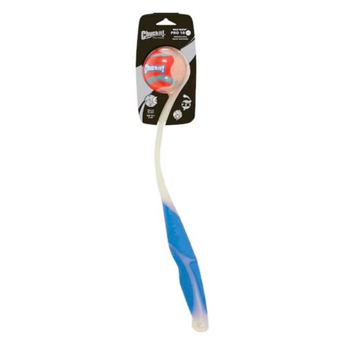 Throw farther faster and never bend down to pick up a slimy ball again with the Chuckit Max glow pro launcher. Durable plastic launcher firmly grasps a tennis ball then releases it as you swing. Picks up tennis balls tossed into mud or water during games of fetch. High performance ergonomic grip handle. No-slobber hands-free pickup. Your dog will love this Max Glow pro launcher made just the right size to use with your Chuckit Max glow ball.