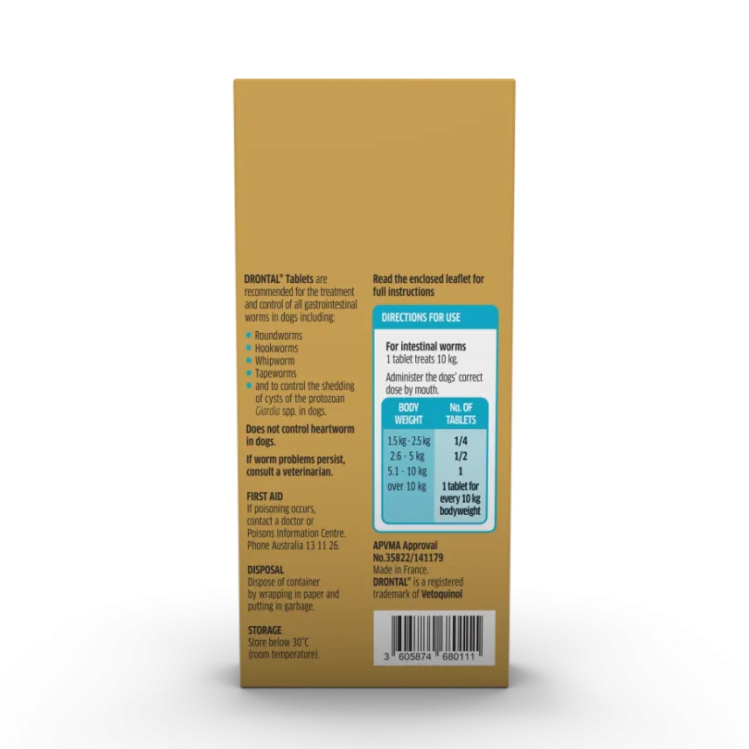 Drontal tablets for medium dogs up to 10kg is a worming tablet that treats your dog for all major species of gastrointestinal worms including roundworm, hookworm, whipworm and tapeworm. Drontal tablets also controls shedding of Giardia oocysts.