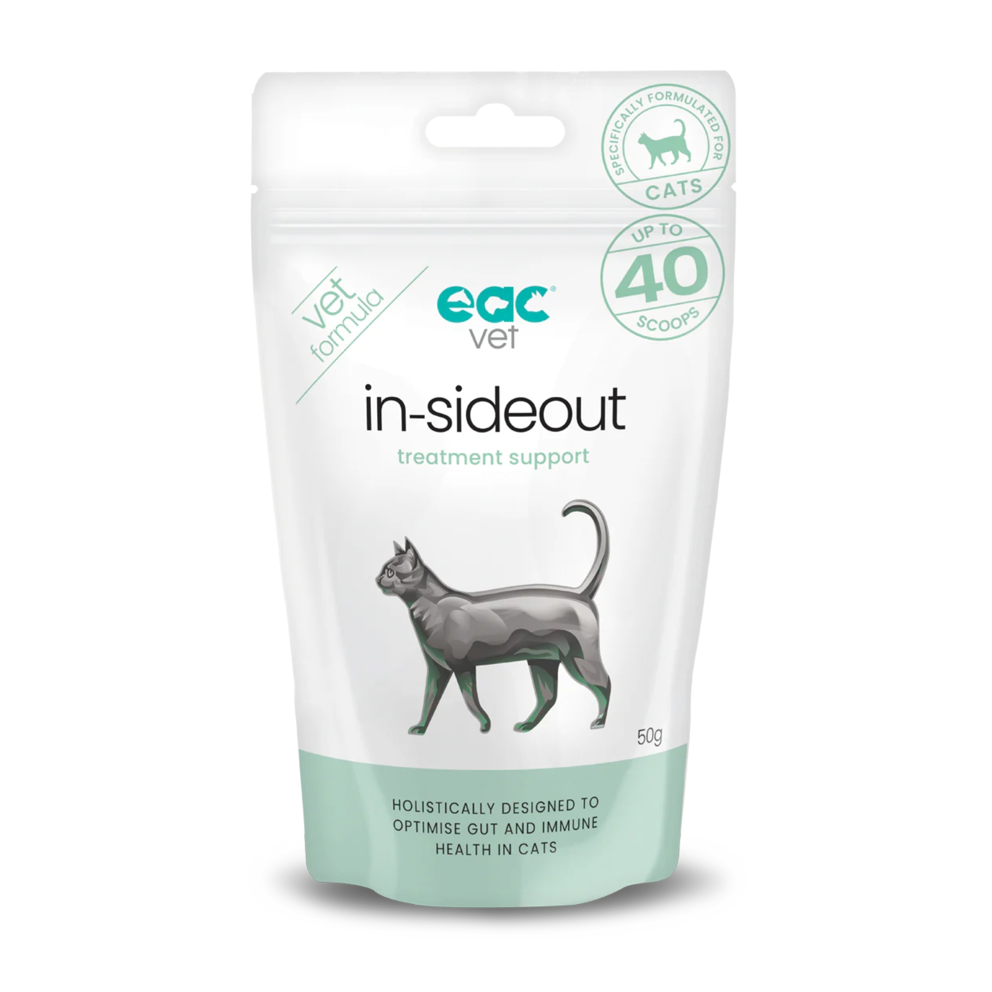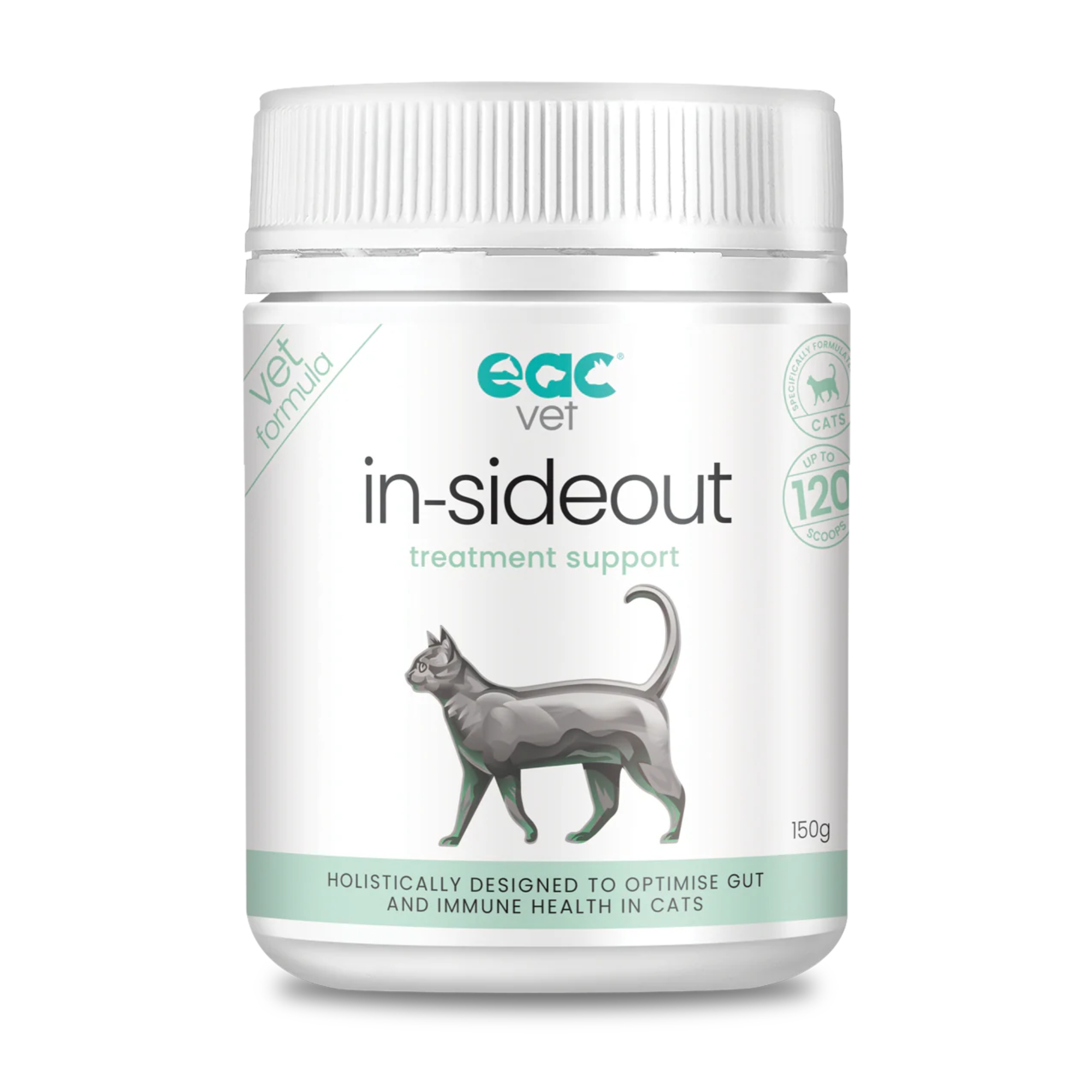 in-sideout Vet Only Treatment Support is a unique blend of nutraceutical ingredients, including pre & probiotics, formulated to promote digestive & immune balance in cats experiencing heightened stress. Research shows the Gastro Intestinal Tract has a significant impact on immune function, stress levels & nutrient absorption. This supplement supports cats during periods of elevated stress & optimises patient outcomes. Supporting patients at times of: