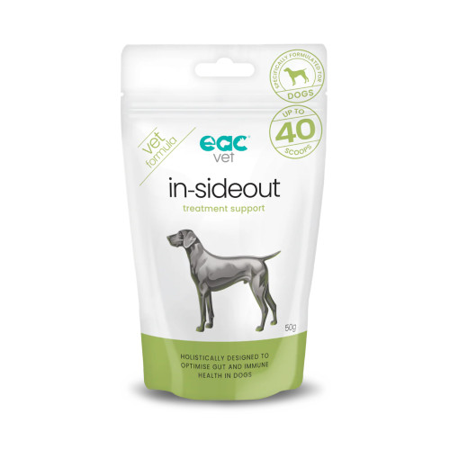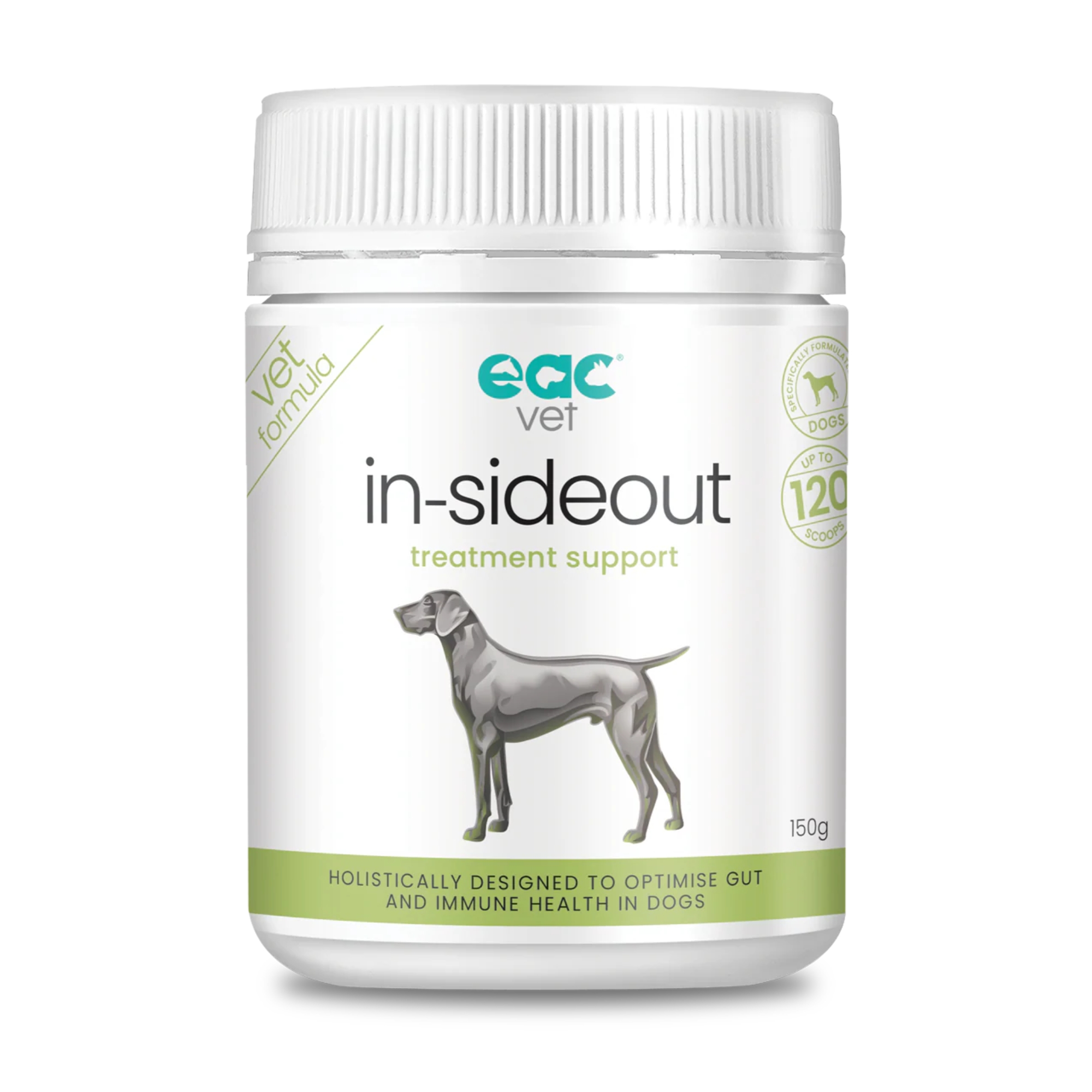 in-sideout Vet Only Treatment Support is a unique blend of nutraceutical ingredients, including pre & probiotics, formulated to promote digestive & immune balance in dogs experiencing heightened stress. Research shows the Gastro Intestinal Tract has a significant impact on immune function, stress levels & nutrient absorption. This supplement supports dogs during periods of elevated stress & optimises patient outcomes. Supporting patients at times of: