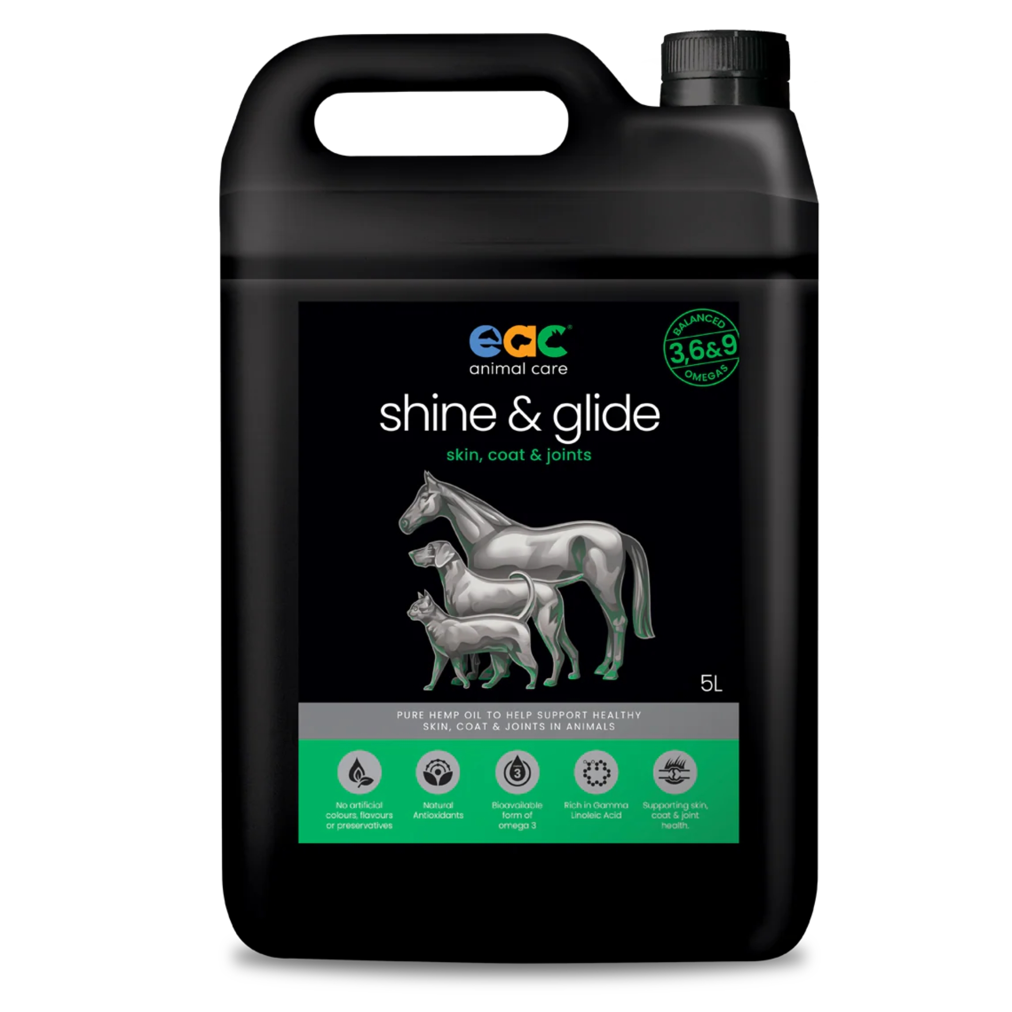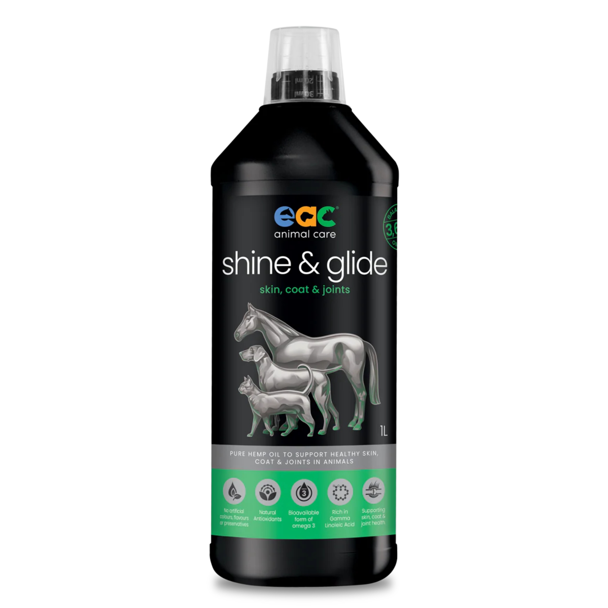 Pure, natural cold-pressed hemp oil - a "cool" energy source high in Omega 3, 6, & 9 for horses, dogs & cats in-sideout, in-fusion msm, in-fusion ha, in-stride & in-sandout. shine & glide may assist with: