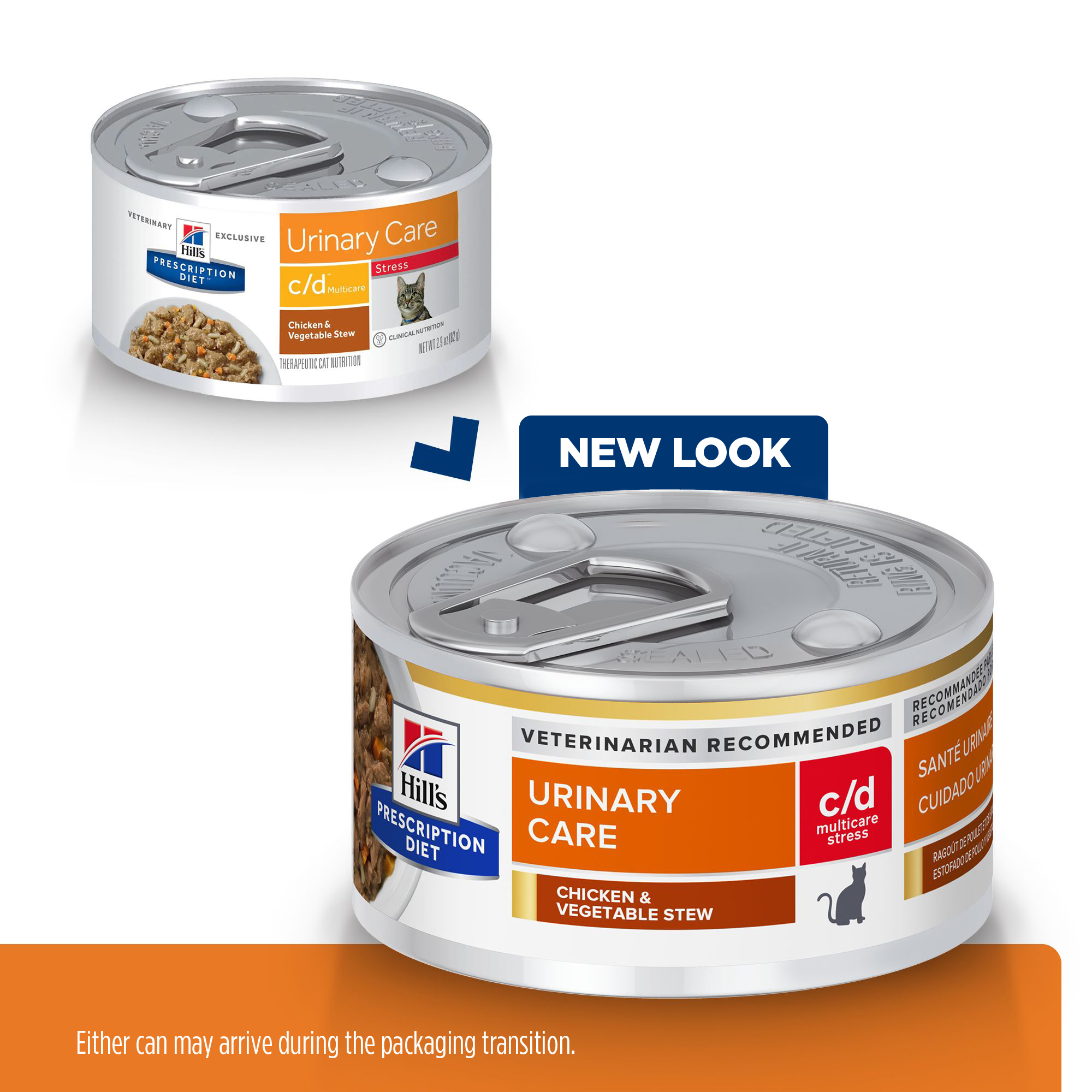 Hill's Prescription Diet c/d Multicare Stress Urinary Care Chicken & Vegetable Stew Wet Cat Food - 24 x 82g cans (3387) was specially developed by nutritionists and veterinarians to support your cats urinary health while also managing stress. In fact, c/d Multicare Stress Urinary Care is clinically tested nutrition to lower the recurrence of most common urinary signs by 89%. Hill's c/d Multicare Stress Urinary Care is a complete and balanced food that provides all the nutrition your cat needs. Key Benefits