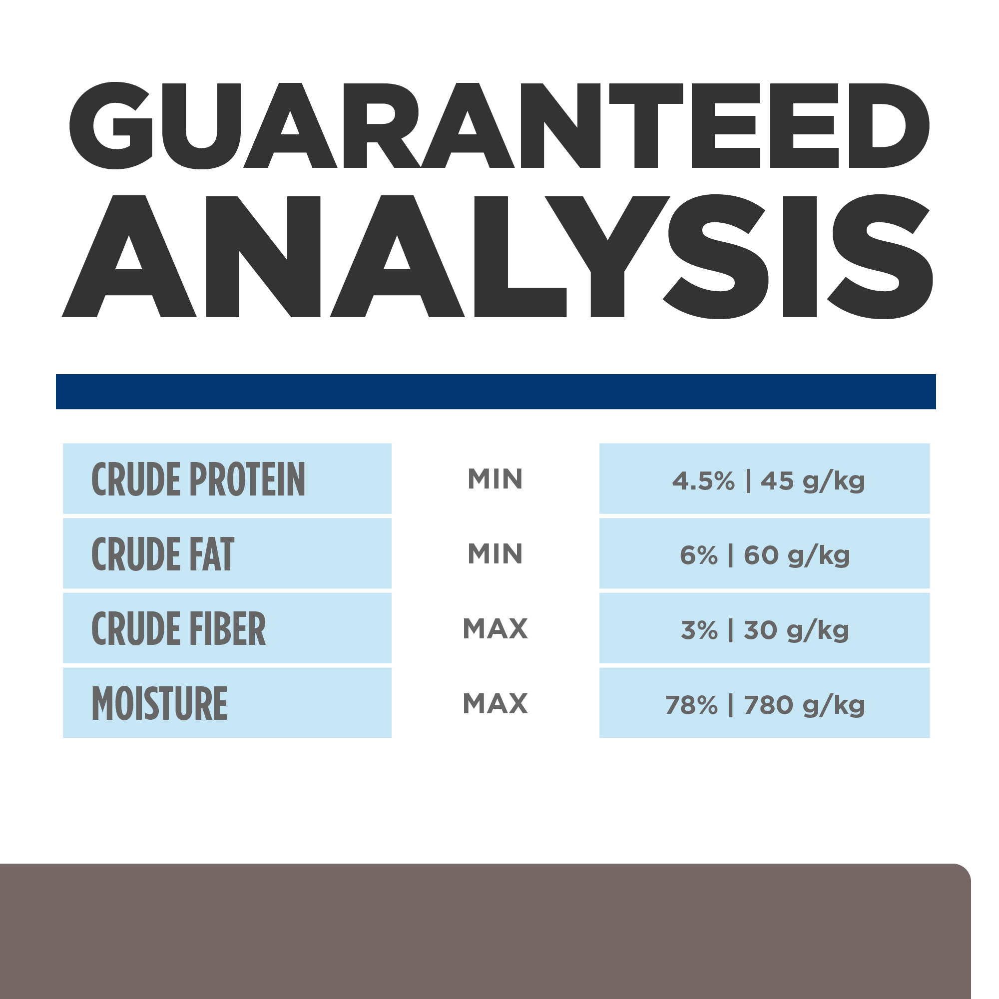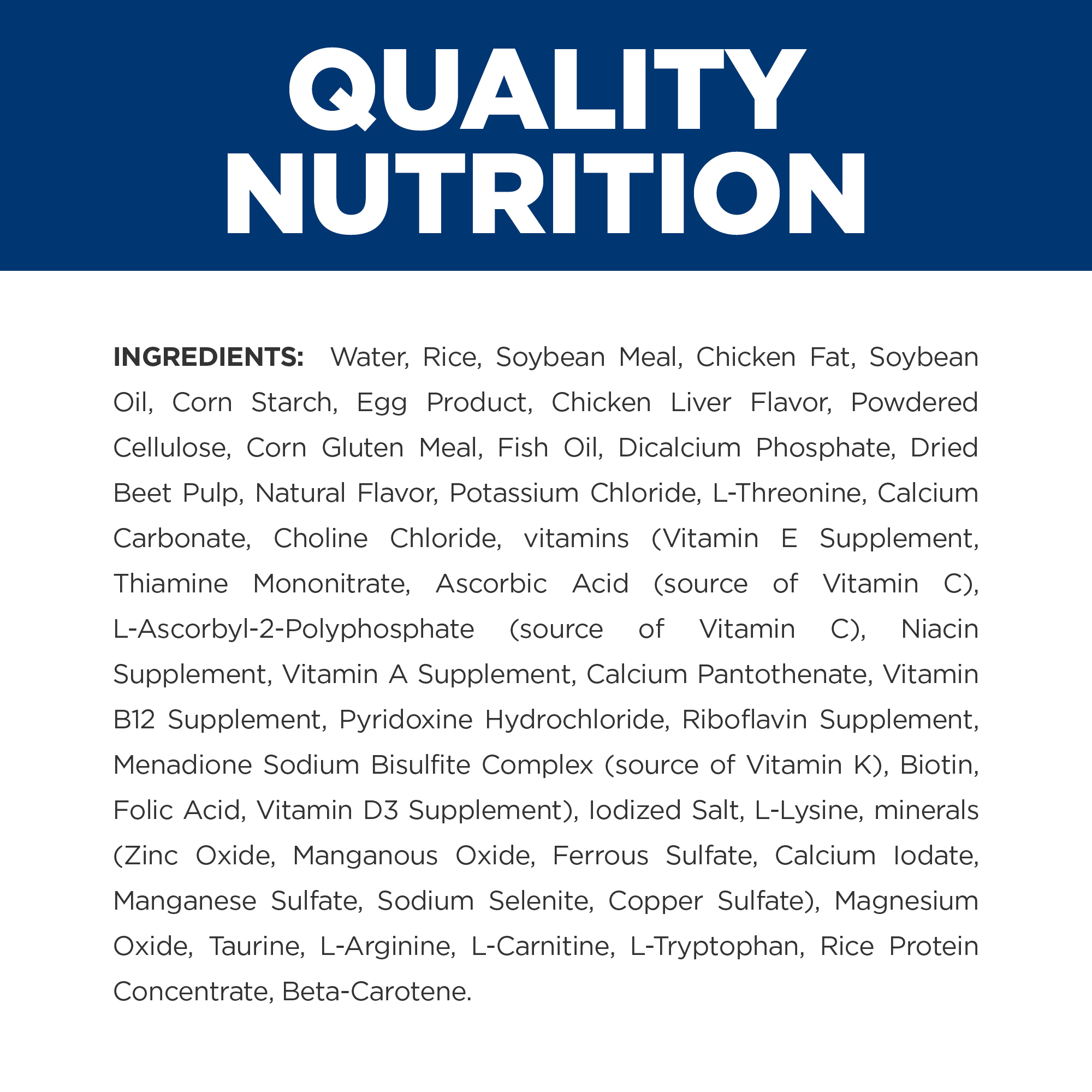| Ingredients | Water, Rice, Soybean Meal, Chicken Fat, Soybean Oil, Corn Starch, Egg Product, Chicken Liver Flavor, Powdered Cellulose, Corn Gluten Meal, Fish Oil, Dicalcium Phosphate, Dried Beet Pulp, Natural Flavor, Potassium Chloride, L-Threonine, Calcium Carbonate, Choline Chloride, vitamins (Vitamin E Supplement, Thiamine Mononitrate, Ascorbic Acid (source of Vitamin C), L-Ascorbyl-2-Polyphosphate (source of Vitamin C), Niacin Supplement, Vitamin A Supplement, Calcium Pantothenate, Vitamin B12 Supplement, Pyridoxine Hydrochloride, Riboflavin Supplement, Menadione Sodium Bisulfite Complex (source of Vitamin K), Biotin, Folic Acid, Vitamin D3 Supplement), Iodized Salt, L-Lysine, minerals (Zinc Oxide, Manganous Oxide, Ferrous Sulfate, Calcium Iodate, Manganese Sulfate, Sodium Selenite, Copper Sulfate), Magnesium Oxide, Taurine, L-Arginine, L-Carnitine, L-Tryptophan, Rice Protein Concentrate, Beta-Carotene. | |||||||||||||||||||||||||||||||||||||||||||||||||||||||||||||||||||||||||