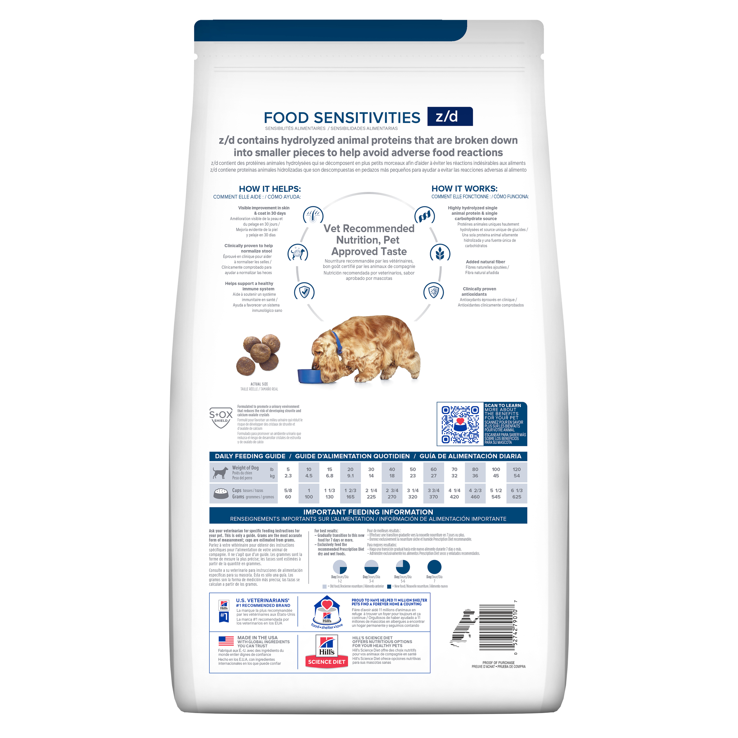 Hill's Prescription Diet z/d is clinical nutrition proven to help avoid skin and digestive signs of adverse food reactions in dogs. It’s made in the USA with global ingredients you can trust, and was developed by Hill’s nutritionists and veterinarians. This nutrition includes natural fibre to help normalise stool. Formulated without additives known to cause food allergies. Also promotes a urinary environment that reduces the risk of developing struvite and calcium oxalate crystals. Please consult your veterinarian for further information on how Prescription Diet foods can help your dog continue to enjoy a happy and active life. Key Benefits