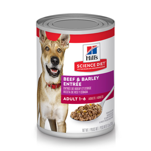 Give your grown dog the premium nutrition they deserve with Hill's Science Diet Adult Beef & Barley Entrée dog food. This canned adult dog food made with natural ingredients is a delicious way to provide precisely balanced nutrition and support the overall health and wellbeing of your pet. Purposely made with easily digestible ingredients, this canned pet food supports your adult dog's skin and coat with omega-6 fatty acids and vitamin E, while the high-quality protein from real beef helps your grown dog maintain muscle. Key Benefits