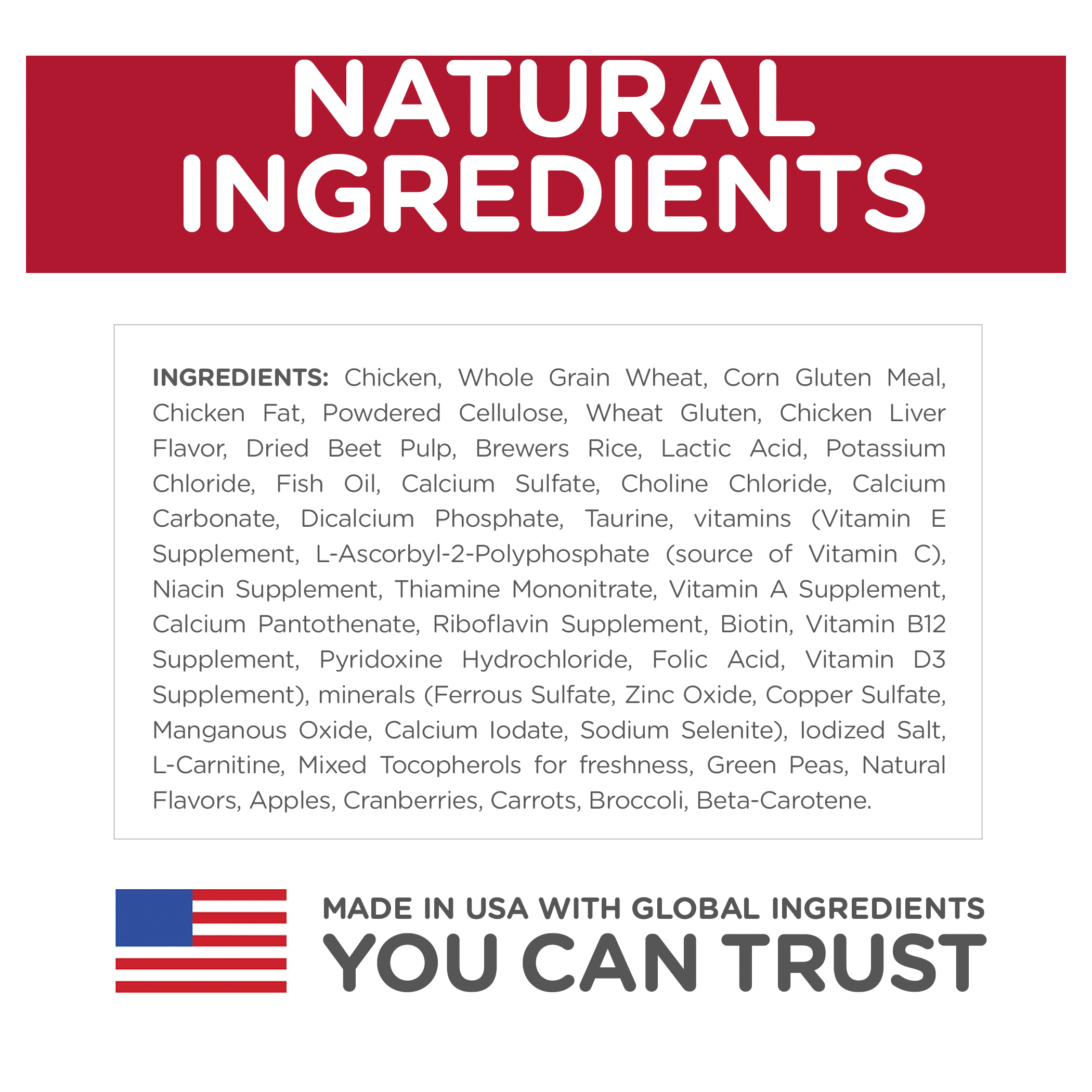 IngredientsChicken, Whole Grain Wheat, Corn Gluten Meal, Chicken Fat, Powdered Cellulose, Wheat Gluten, Chicken Liver Flavor, Dried Beet Pulp, Brewers Rice, Lactic Acid, Potassium Chloride, Fish Oil, Calcium Sulfate, Choline Chloride, Calcium Carbonate, Dicalcium Phosphate, Taurine, vitamins (Vitamin E Supplement, L-Ascorbyl-2-Polyphosphate (source of Vitamin C), Niacin Supplement, Thiamine Mononitrate, Vitamin A Supplement, Calcium Pantothenate, Riboflavin Supplement, Biotin, Vitamin B12 Supplement, Pyridoxine Hydrochloride, Folic Acid, Vitamin D3 Supplement), minerals (Ferrous Sulfate, Zinc Oxide, Copper Sulfate, Manganous Oxide, Calcium Iodate, Sodium Selenite), Iodized Salt, L-Carnitine, Mixed Tocopherols for freshness, Green Peas, Natural Flavors, Apples, Cranberries, Carrots, Broccoli, Beta-Carotene. Nutritional AnalysisCalorific content: 3790 kcal/kg (398 kcal/cup†).