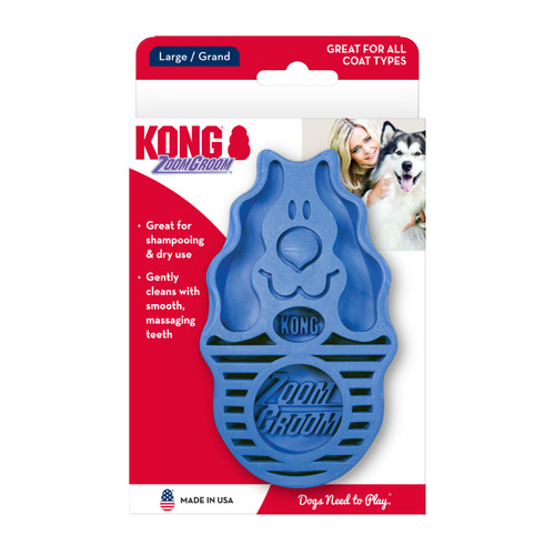 The KONG ZoomGroom™ helps make it easier to get your dogs clean. While shampooing use the ZoomGroom™ to clean your dogs’ coat. The 3/4 inch rubber fingers reach through the coat to massage the skin, stimulating capillaries and natural oil production leading to a healthy coat for your dog.