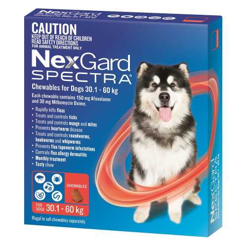 NexGard Spectra Red for dogs weighing between 30.1kg and 60kg is a revolutionary new parasite control product that protects your dog from fleas, ticks, intestinal worms, and heartworm for a full month.