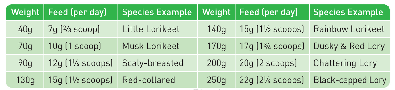 - Ration daily feed to no more than 3g (⅓ scoop) per bird per day.
