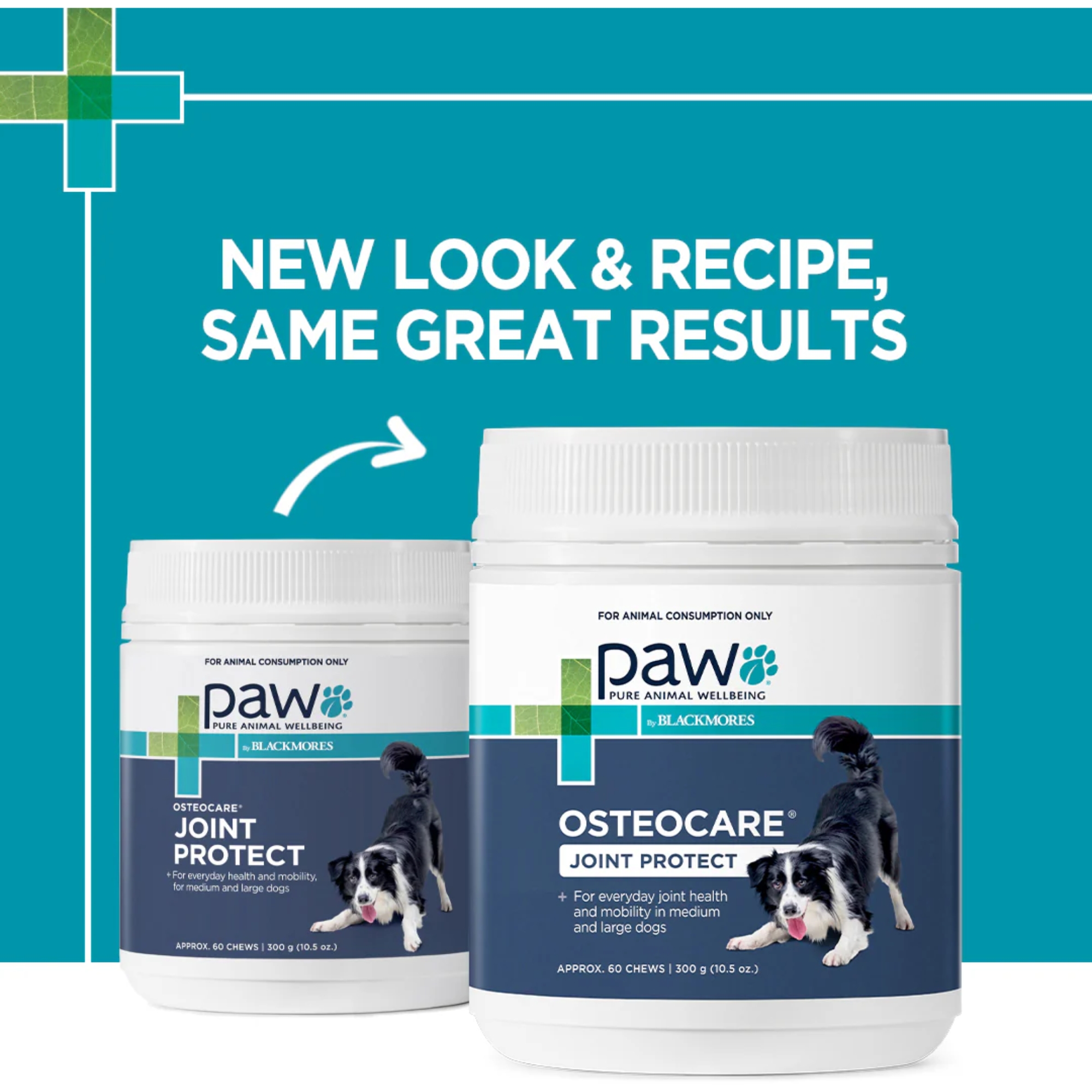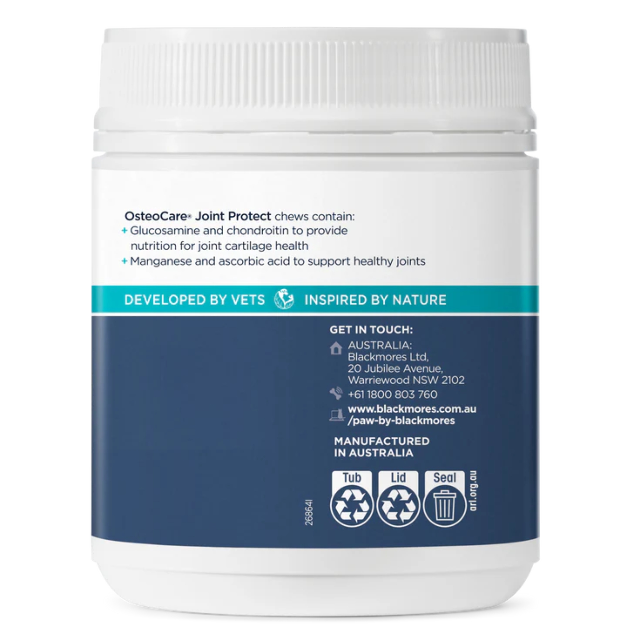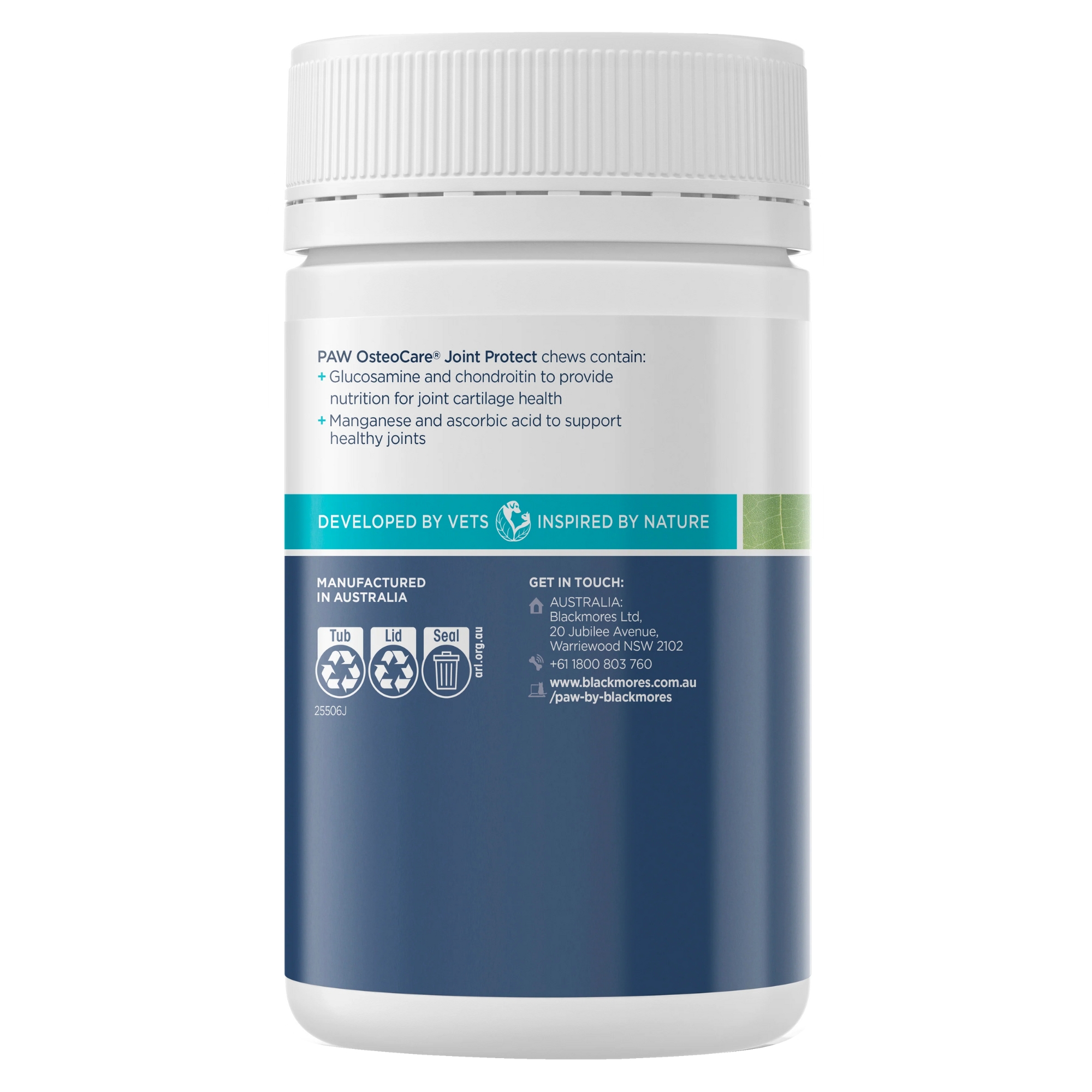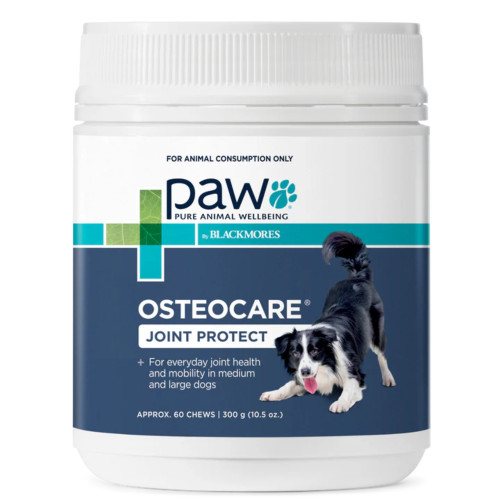 PAW OsteoCare® Joint Protect chews can be used if your dog is showing symptoms of stiffness, and limping or as a preventative measure. These chews are a great option for young active dogs as well as older dogs at risk of developing osteoarthritis. This supplement can be used if your dog is showing symptoms, or as an aid of preventive measure, and is a great daily treat they’ll love. Containing glucosamine and chondroitin which are naturally found in joint cartilage, these chews are a great option for young active dogs as well as older dogs at risk of developing osteoarthritis. Easy to give your pet daily, they come in a convenient to store bottle and will help keep them running and fetching happily. Key Benefits