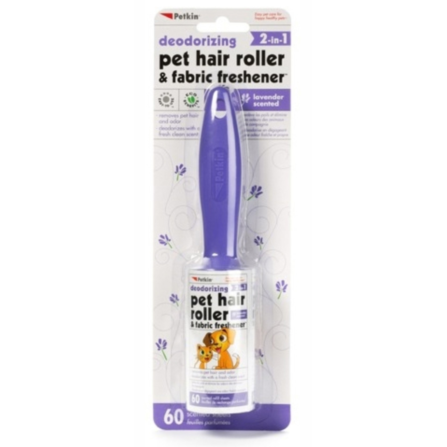 Petkin 2n1 Pet Hair Roller & Fabric Freshener combines powerful hair-lifting sheets with deodorizing fabric freshener infused inside. Use as you would a regular lint roller. Simply roll on clothing or furniture to lift away pet hair and reduce odors, while leaving behind a fresh lavender scent. Quickly removes lint, dust, dandruff and pet hair from almost any surface. Safe for all fabrics, leather, nylon, etc. Also works great on floors, windows, bedspreads, even your bathroom. There are hundreds of uses around the house, your car or in your workplace. 60 easy-peel layers per roll. Key Features
