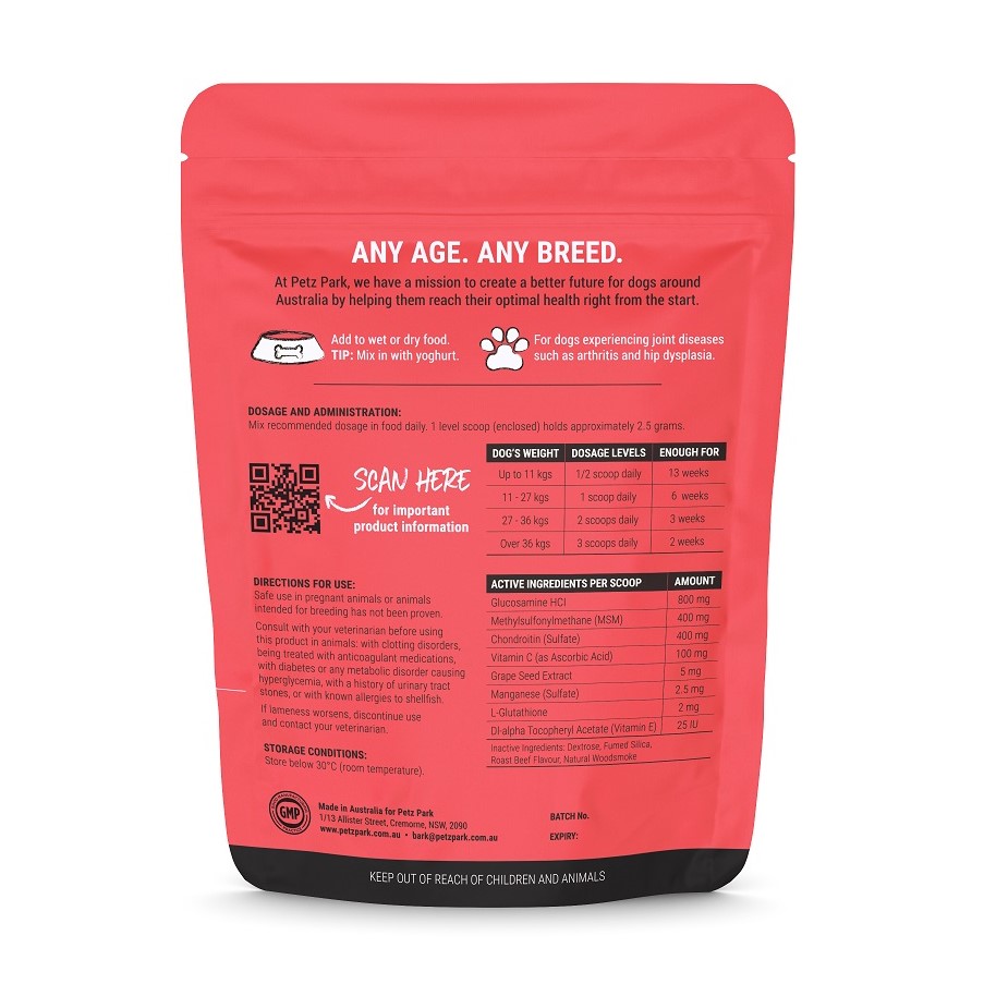 Petz Park Hip + Joint Powder Supplement For Dogs is designed to promote healthy joints and mobility for dogs with common joint related problems such as arthritis, hip dysplasia and growing pains in dogs. Petz Park Hip + Joint Powder contains the active Glucosamine, Methylsulfonylmethane (MSM) and Chondroitin which are all known for their ability to hemp reduce joint pain and inflammation. |