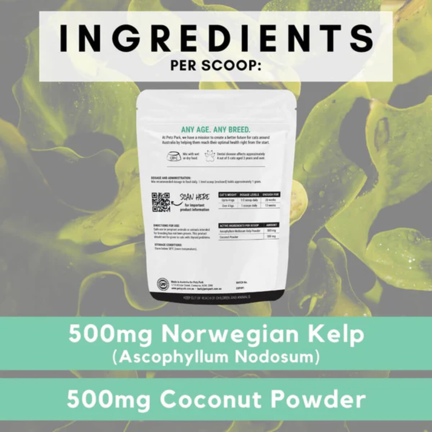 Petz Park Plaque Control Dental Kelp Powder Supplement for Cats helps keep your cat's teeth disease free and squeaky clean. This powdered supplement features Ascophyllum Nodosum, (more commonly named Norwegian Kelp) and coconut. Key Benefits