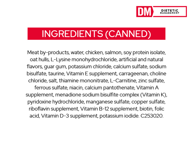IngredientsMeat by-products, water, chicken, salmon, soy protein isolate, oat hulls, L-Lysine monohydrochloride, artificial and natural flavours, guar gum, potassium chloride, calcium sulfate, sodium bisulfate, taurine, Vitamin E supplement, carrageenan, choline chloride, salt, thiamine mononitrate, L-Carnitine, zinc sulfate, ferrous sulfate, niacin, calcium pantothenate, Vitamin A supplement, menadione sodium bisulfite complex (Vitamin K), pyridoxine hydrochloride, manganese sulfate, copper sulfate, riboflavin supplement, Vitamin B-12 supplement, biotin, folic acid, Vitamin D-3 supplement, potassium iodide. Guaranteed Analysis