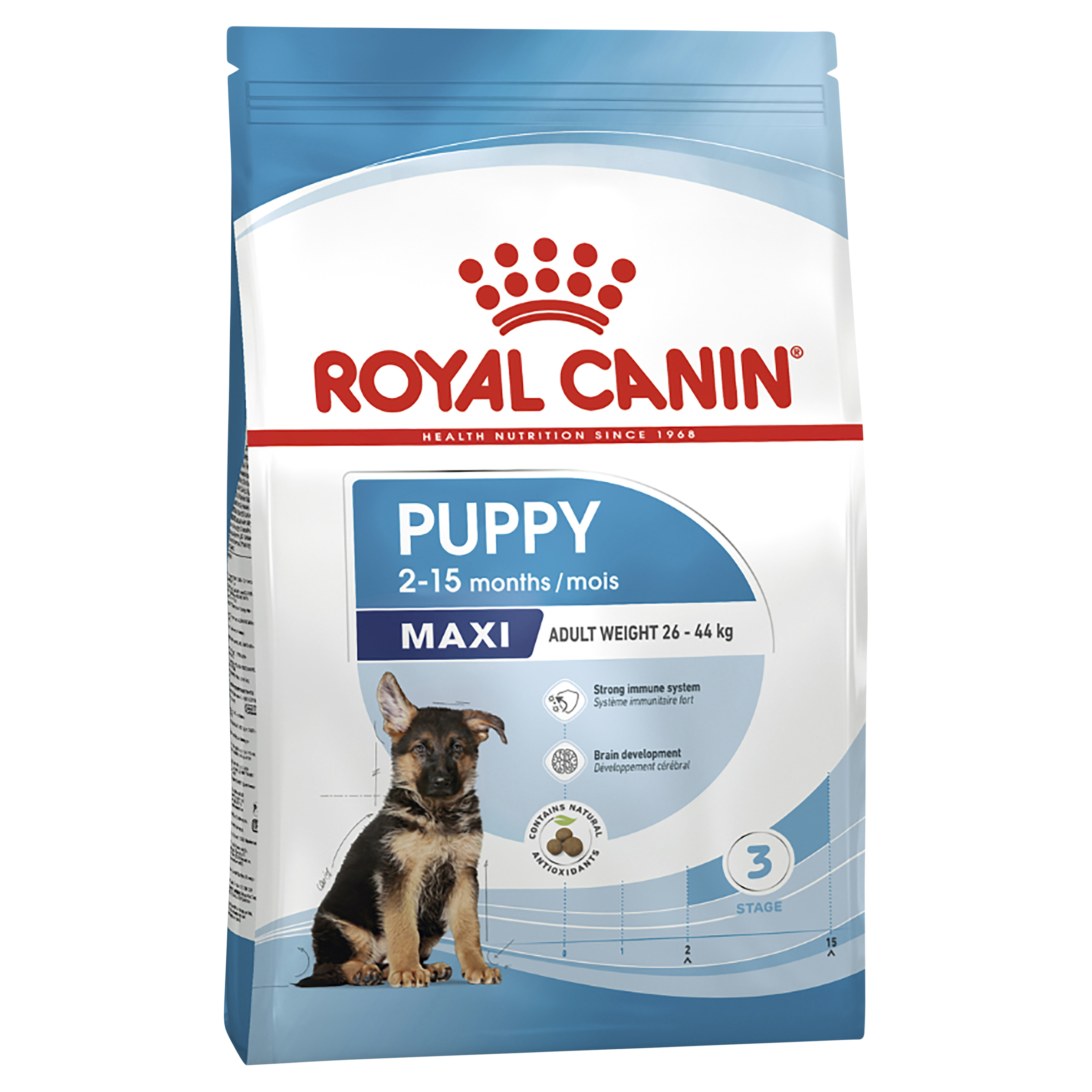 Royal Canin Maxi Puppy Dry Food is a nutritionally balanced diet for large breed puppies from 2 - 15 months. This premium puppy food is formulated with highly digestible proteins and fibres to support optimal digestive health and improve stool quality. Royal Canin Maxi Puppy has an optimal energy content to support your large breed puppy through their growth period, as well as balanced levels of calcium and phosphorus to promote healthy bone and joint development. With the addition of antioxidants and prebiotics, Royal Canin Maxi Puppy also helps to support your puppy's natural immune defences, it also contains nutrients to bind salivary calcium to help reduce dental tartar build up for good oral health. Key Benefits