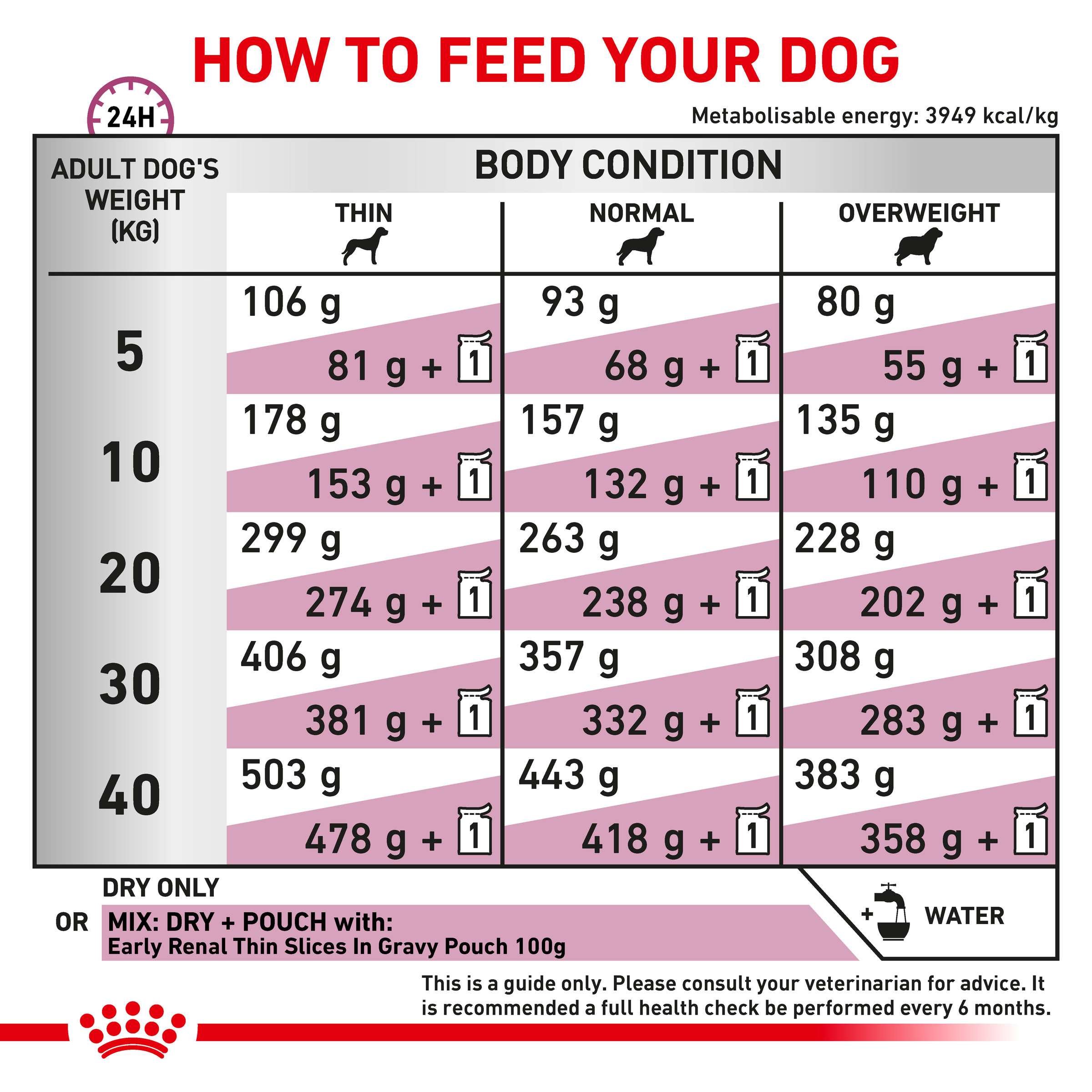 Royal Canin Veterinary Diet Canine Early Renal Dry Dog Food is a nutritionally balanced diet for adult dogs that require support for early stage chronic kidney disease or temporarily reduced renal function. The diet includes a low level of phosphorus and high quality, highly digestable proteins. Early Renal diet is recommended when the dog is diagnosed in CKD stage 1 or early stage 2 and non-proteinuric. Dogs may remain on Early Renal until creatinine elevates outside of reference ranges. At this point, the dog should be switched to a renal diet. It is recommended that a full health check be performed every 6 months. Key Benefits