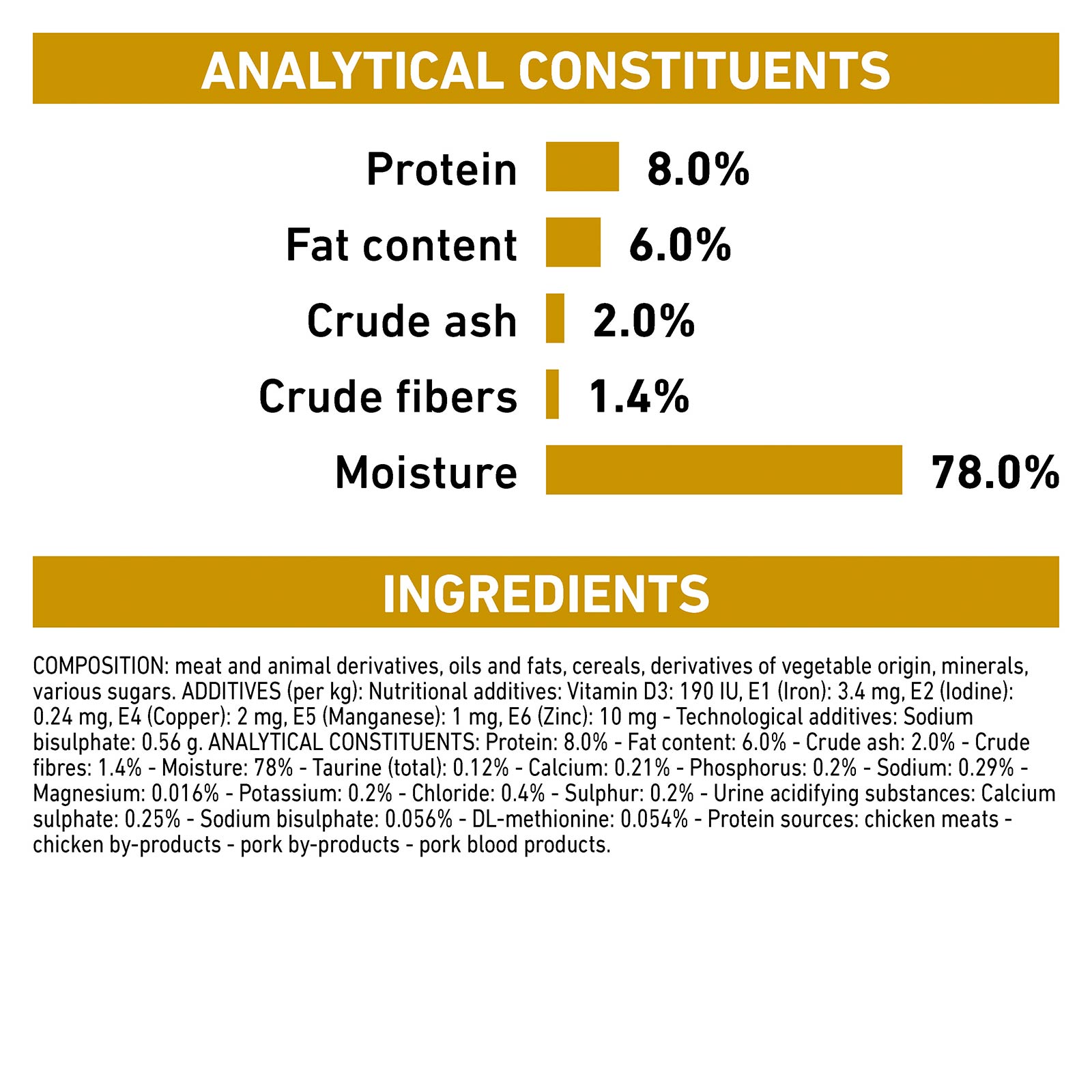 | Ingredients | Composition: Meat and animal derivatives, oils and fats, cereals, derivatives of vegetable origin, minerals, various sugars. Additives (per kg): Nutritional additives: Vitamin D3: 190 IU, E1 (Iron): 3.4 mg, E2 (Iodine): 0.24 mg, E4 (Copper): 2 mg, E5 (Manganese): 1 mg, E6 (Zinc): 10 mg - Technological additives: sodium bisulfate: 0.56 g. Analytical constituents: Protein: 8.0% - Fat content: 6.0% - Crude ash: 2.0% - Crude fibres: 1.4% - Moisture: 78% - Taurine (total): 0.12% - Calcium: 0.21% - Phosphorus: 0.2% - Sodium: 0.29% - Magnesium: 0.016% - Potassium: 0.2% - Chloride: 0.4% - Sulfur: 0.2% - Urine acidifying substances: calcium sulfate: 0.25% - sodium bisulfate: 0.056% - DL Methionine: 0.054%. Metabolisable energy: 96 kcal/100g. |