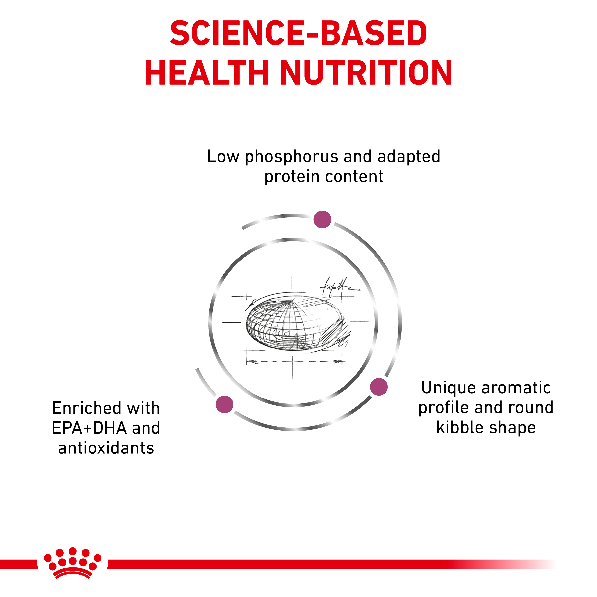 Royal Canin Veterinary Diet Feline Renal Dry Food is a complete dietetic feed for adult cats formulated to support renal (kidney) function in the case of chronic renal insufficiency, through its restricted levels of phosphorus and high-quality proteins. Complete dietetic feed for adult cats.