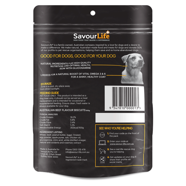 SavourLife's all-natural, oven-baked Australian Beef Flavour Biscuits contain no artificial flavours, colours or preservatives. Our protein-packed biscuits are made from Australian ingredients including real Australian beef, eggs and whole Linseed. We use only the best natural ingredients for optimal health and nutrition, then we bake them to perfection, giving them a crunchy texture, which is great for promoting healthy teeth and gums. The addition of extra Linseed gives a natural boost of vital Omega 3&6 acids and is an added benefit in our Shiny Coat Formula. The perfect choice for a healthy and delicious treat for your dog. Key Benefits
