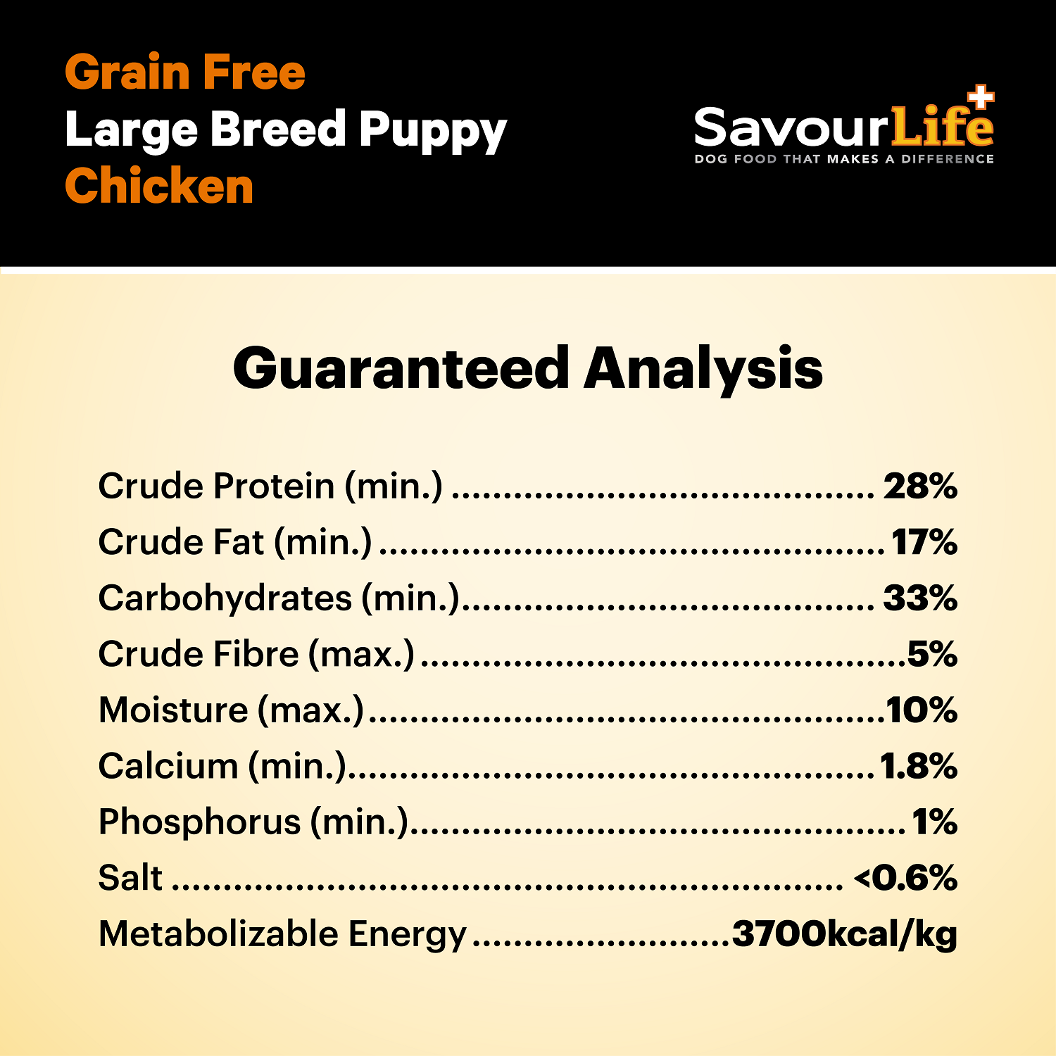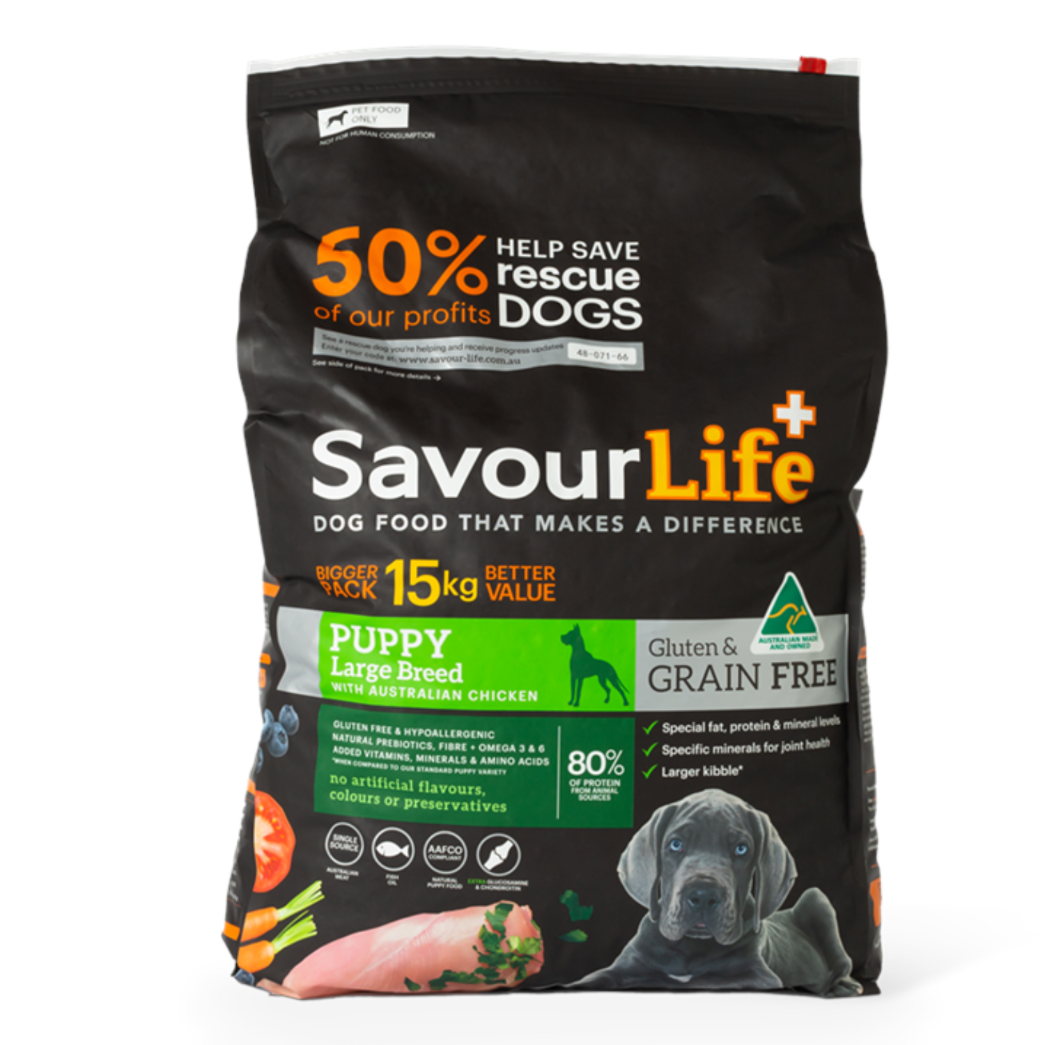 The first months of a puppy’s life are crucial to their long-term health and well-being. Puppies require more nutrients and energy than older dogs to help them grow into the best dog they can be. With all the healthy vitamins, minerals and nutrients to ensure your puppy’s development; SavourLife’s Grain-Free for Large Breed Puppies with Australian Chicken is an all-natural, holistic, Australian-made, grain-free, gluten-free food with natural superfood inclusions. We have added the perfect blend of vitamins, minerals, natural prebiotics and amino acids and it contains absolutely no artificial flavours, colours or preservatives. It has specific vitamins, mineral and fat/protein ratios specifically designed for large breed puppy needs, plus a larger kibble size too! It is made with premium Australian chicken, the perfect meat for puppies’ sensitive tummies, making it the perfect food for your puppy! Key Benefits