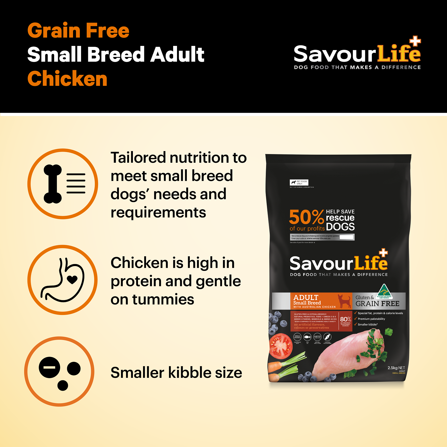 SavourLife’s Grain-Free Small Breed Adult food is an all-natural, holistic, Australian-made, gluten-free food with natural superfood inclusions like chicory, kelp and blueberries. It is bursting with single-source Australian chicken meat plus vitamins, minerals, natural prebiotics and amino acids. It contains no artificial flavours, colours or preservatives. It has premium palatability, special fat/protein/calorie ratios specifically designed for small breed dog needs, plus a smaller kibble size too! Key Benefits