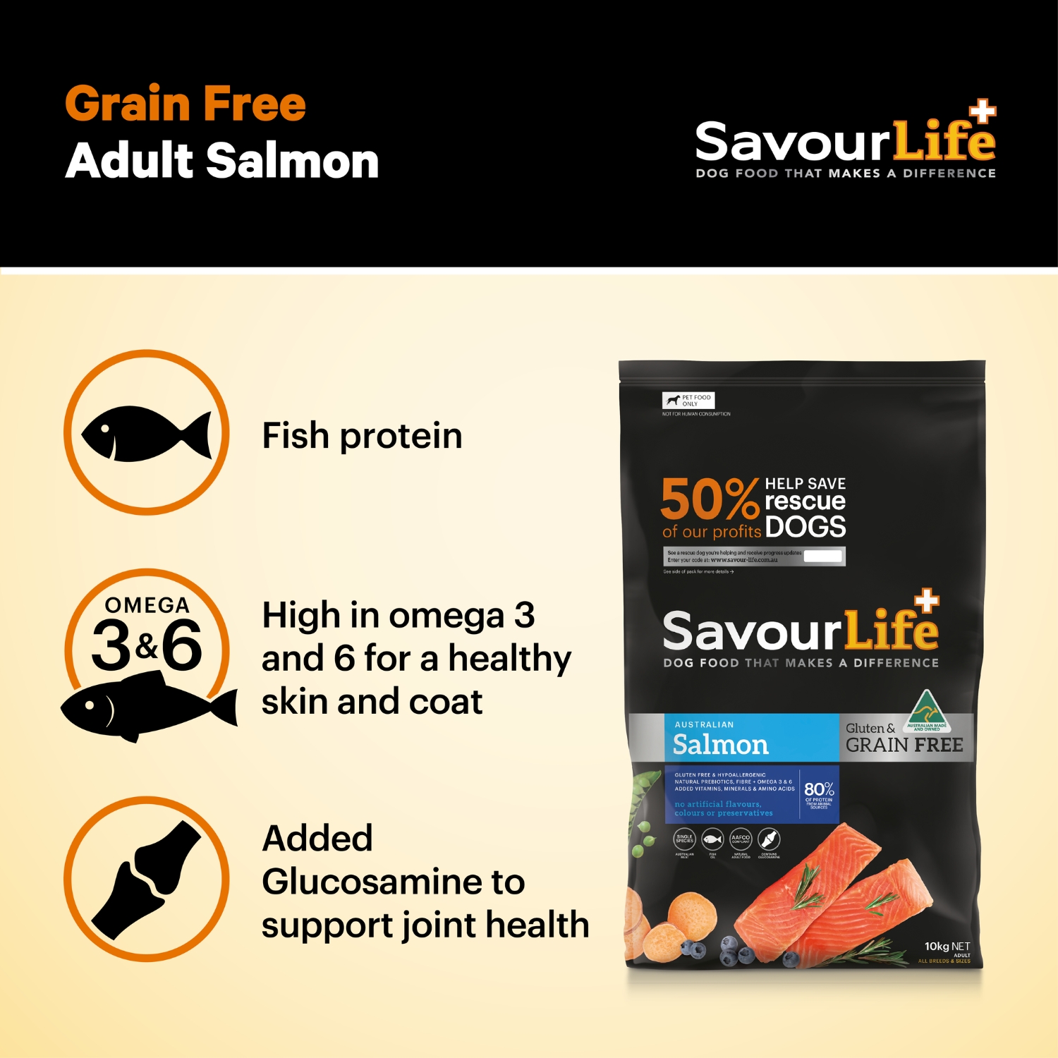 SavourLife’s Grain-Free Salmon is an excellent source of natural nutrients for dogs of all sizes and ages. Excellent for dogs with allergies, and with a burst of Omega 3 & 6 perfect for a shiny coat and healthy skin, it also tastes delicious, making it a popular choice! It is an all-natural, holistic, Australian-made, grain-free, gluten-free food with natural superfood inclusions like Sweet Potato, Yucca, Kelp, Carrot, Broccoli and Blueberries; plus vitamins, minerals, natural prebiotics and amino acids. There are absolutely no artificial flavours, colours or preservatives. Key Benefits