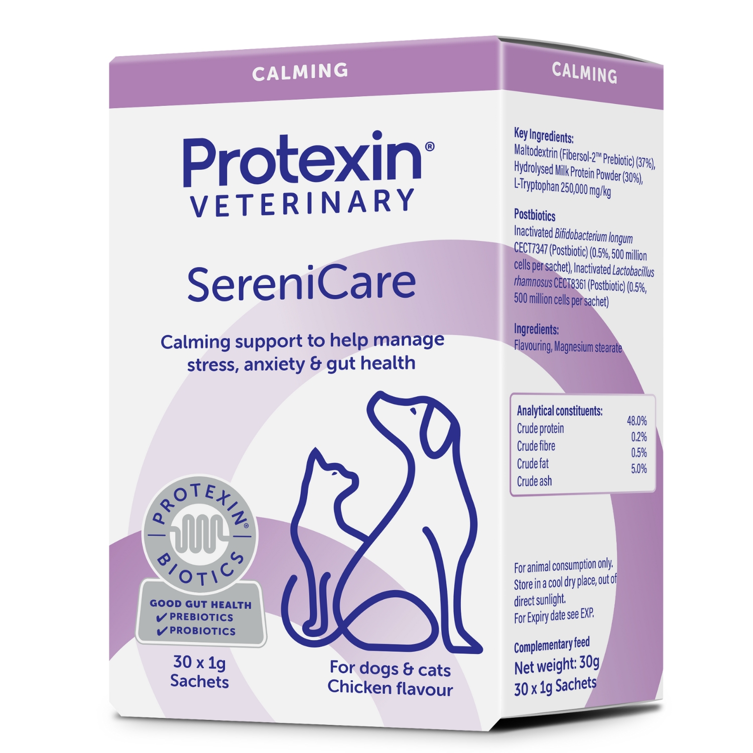 SereniCare is a calming support for dogs and cats, containing a novel postbiotic blend, Alpha-casozepine (Hydrolysed Milk Protein) and L-tryptophan. Formulated to help manage stress, anxiety and gut health. Key Features