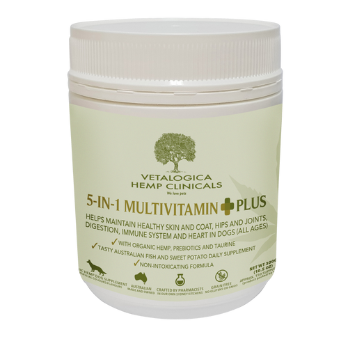 Vetalogica Hemp Clinicals 5-in-1 Multivitamin Dog Supplements (300g) contain a unique formula designed to support overall wellness and immunity in dogs. With organic hemp, prebiotics and taurine, these non-intoxicating treats can help maintain healthy skin, joints, digestion, immunity, and heart health. These delicious treats are completely free from grains, glutens, GMOs, or artificial colours and flavours.