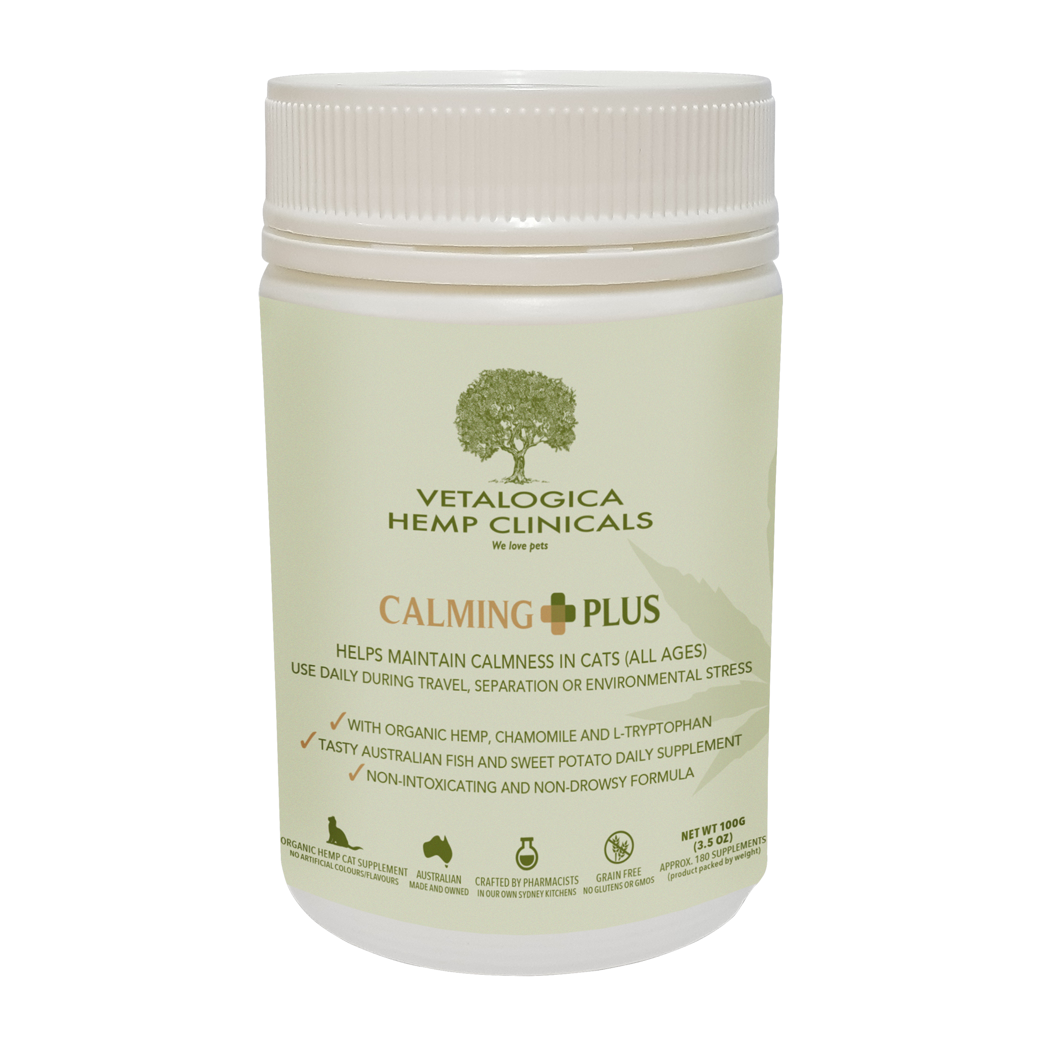 Vetalogica Hemp Clinicals Calming Cat Supplements (100g) contain a unique formula designed to gently calm and appease cats. With organic hemp, chamomile and L-tryptophan, these non-intoxicating supplements can be used to reduce stress during travel, a new environment, the introduction of new pets, or other anxiety-evoking situations. This supplements contains real Australian fish and sweet potato, and are completely free from grains, glutens, GMOs, or artificial colours and flavours.
