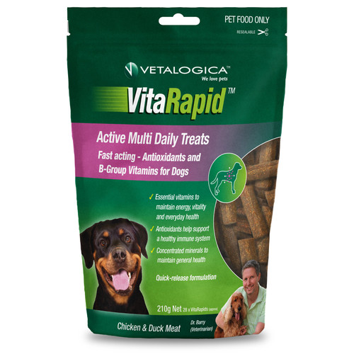 Vetalogica Vitarapid Active Multi Daily Treats can be given as a treat to dogs of all ages with or without food. Vetalogica Vitarapid Active Multi Daily Treats should be given in conjunction with a balanced diet. Vetalogica Vitarapid Active Multi Daily Treats can be used in conjunction with Vetalogica Canine Multi + Immune Complex.