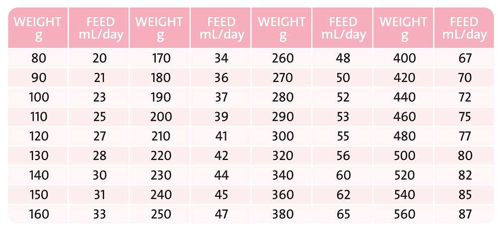 - Feed every 2 hours for the first 3 days, reducing this to every 4 hours by week one and every 6 hours by week two.