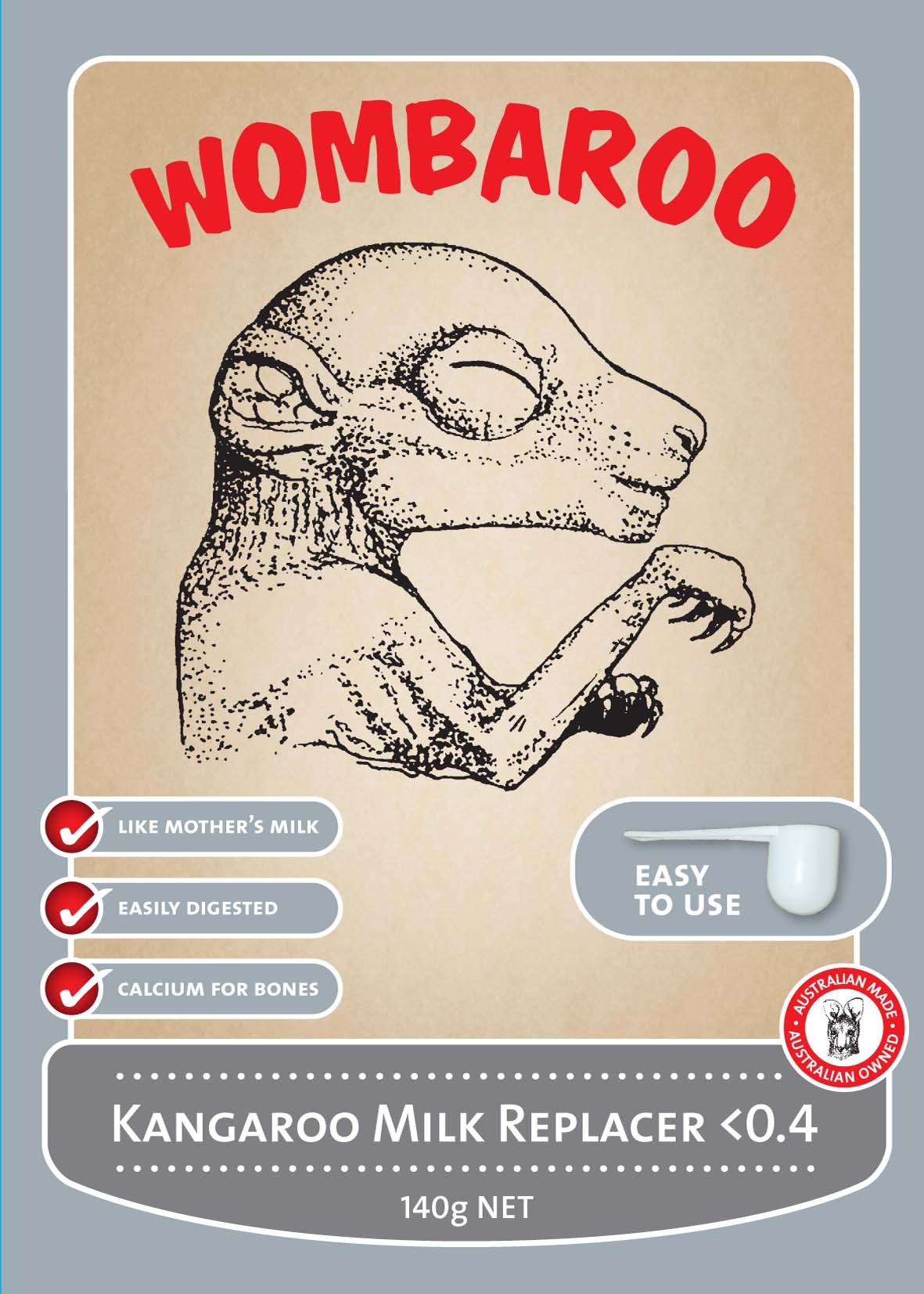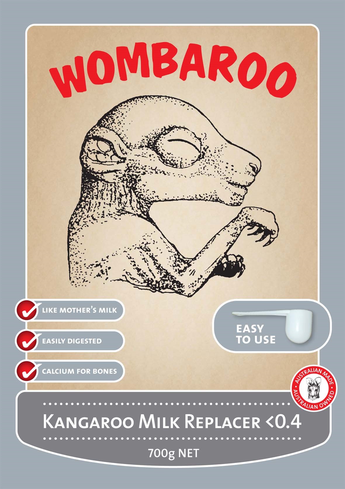Wombaroo Kangaroo Milk Replacer <0.4 is a nutritionally balanced milk substitute for macropod (kangaroo & wallaby) joeys with less than 40% of their pouch life completed.