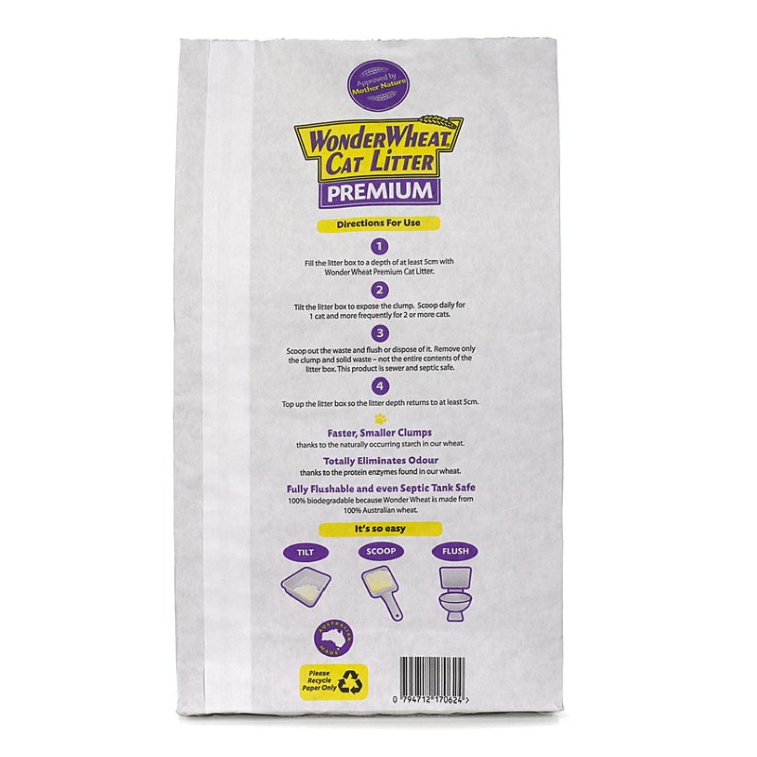 Wonder Wheat Cat Litter Premium is a fully flushable, biodegradable cat litter made from 100% Australian grown, farmed and milled wheat. The protein enzymes in the wheat neutralise and absorb any cat odour, organically! Wonder Wheat Cat Litter works naturally without the use of chemicals, additives or cover up perfumes. The new Premium formula clumps faster, clumps smaller and totally eliminates odour. Wonder Wheat Premium lasts even longer than the original formula, making it suitable for multi-cat homes. Key Features