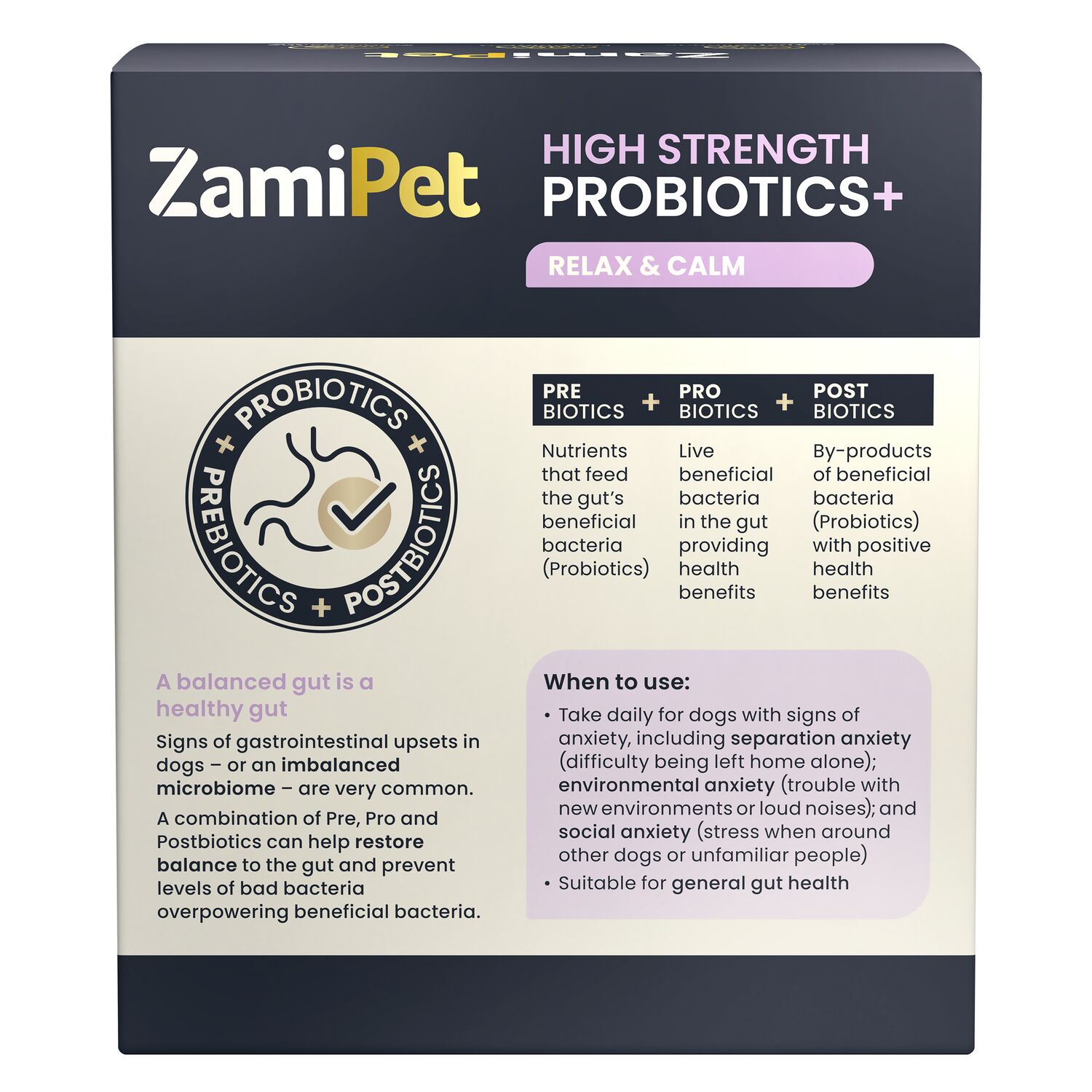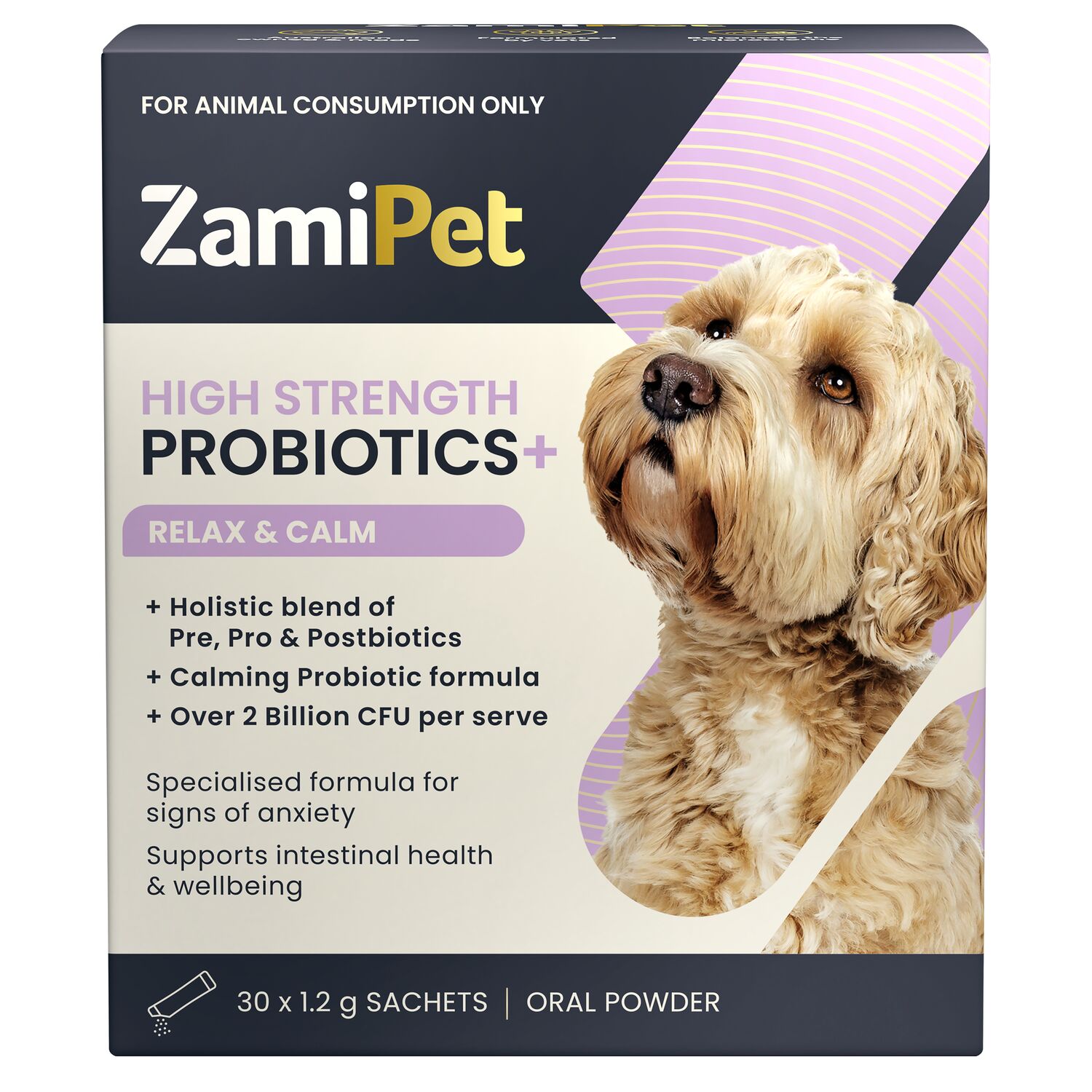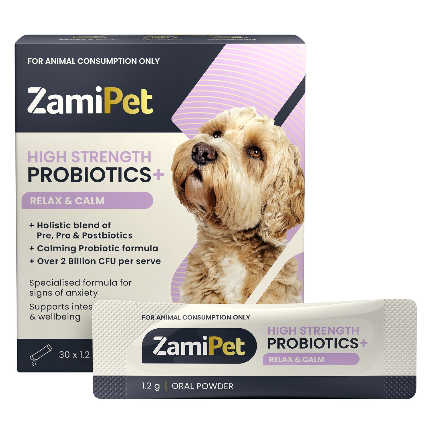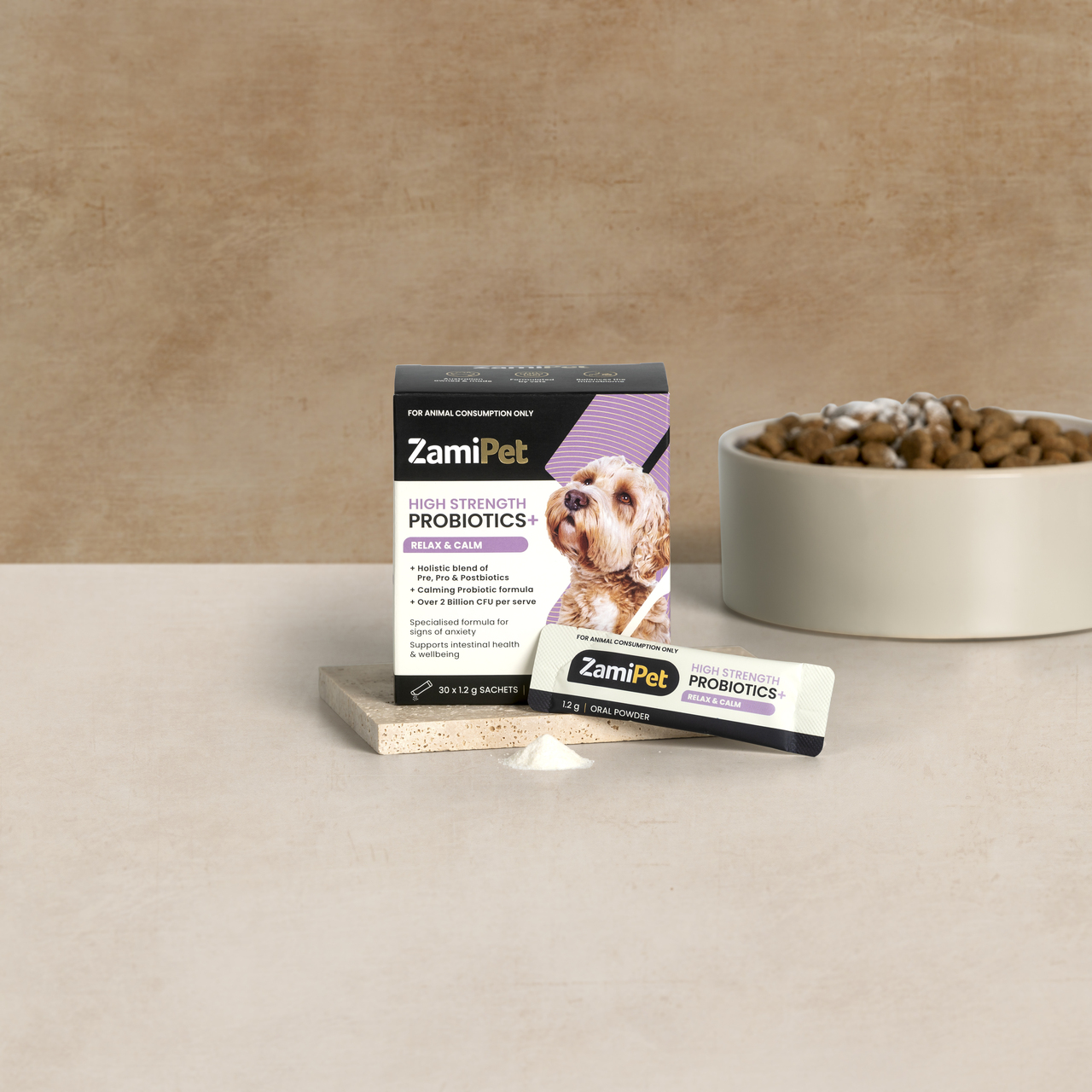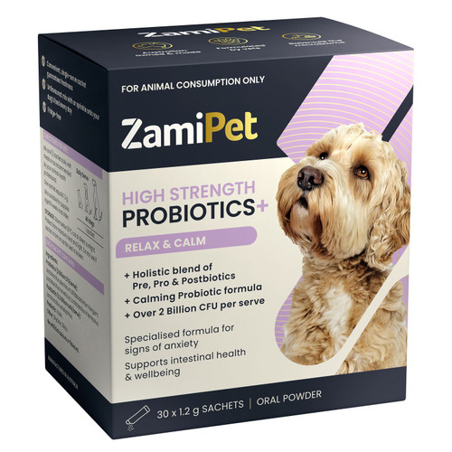ZamiPet High Strength Probiotics+ Relax & Calm is a specialised formula for dogs with symptoms of stress and anxiety, and also provides support for daily digestive health. Packed in a convenient, single-serve sachet for guaranteed freshness, this fridge-free probiotic+ powder is unflavoured, so it can be mixed with or sprinkled onto your pet’s food each day.