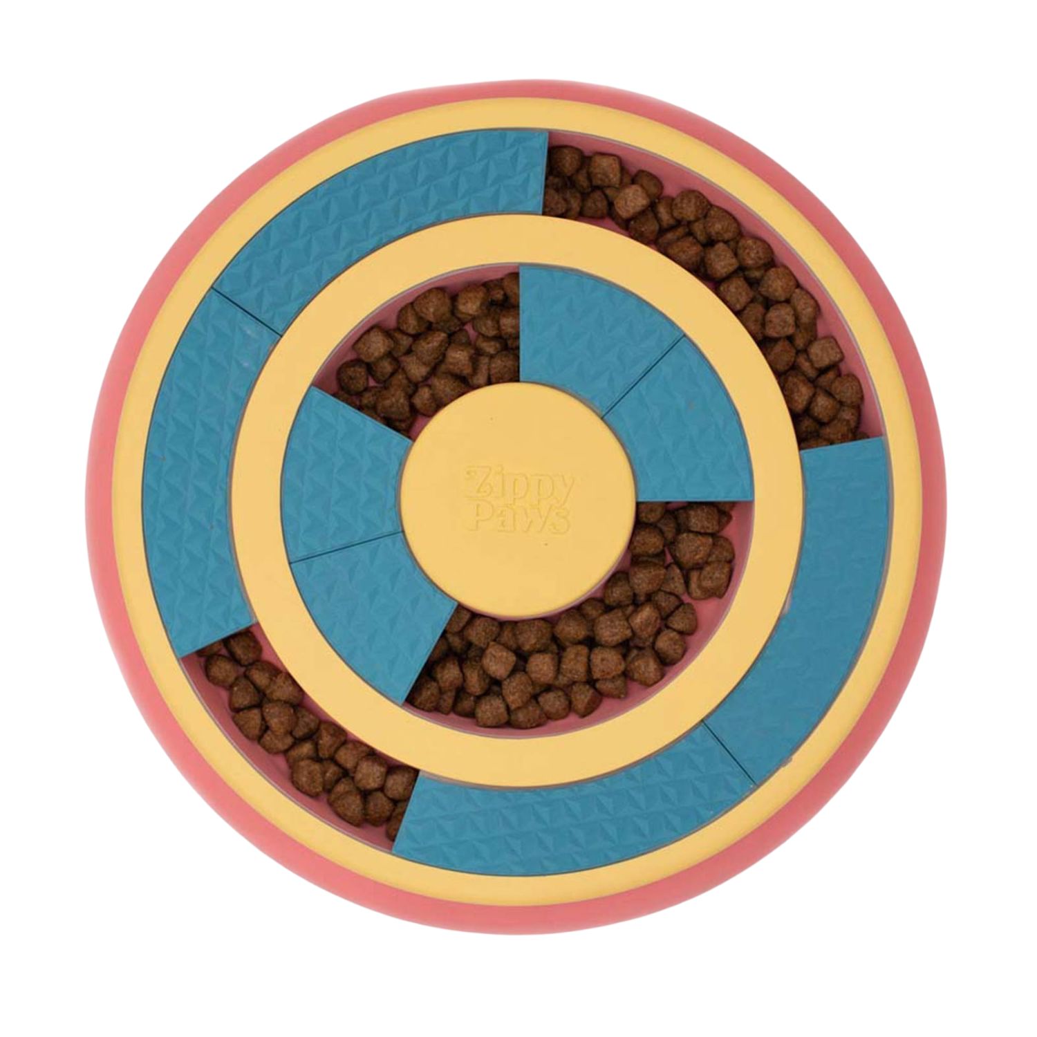 The SmartyPaws Wagging Wheel Puzzler Feeder Bowl is an all new interactive puzzler toy from ZippyPaws that doubles as a slow feeder bowl for eager eaters. The Wagging Wheel features textured slide panels that make eating a bit of a challenge and whole lot of fun! The puzzle design allows your dog to eat slower - helping to prevent bloating, belching and choking - and promotes a healthy diet and weight. Holds 3 cups of food! And it can also be used for treats. Non-slip base prevents sliding.