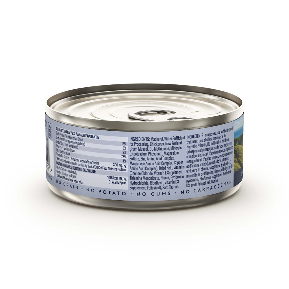 Mackerel, Water Sufficient for Processing, Chickpeas, New Zealand Green Mussel, DL-Methionine, Minerals (Dipotassium Phosphate, Magnesium Sulfate, Zinc Amino Acid Complex, Manganese Amino Acid Complex, Copper Amino Acid Complex), Dried Kelp, Vitamins (Choline Chloride, Vitamin E Supplement, Thiamine Mononitrate, Niacin, Pyridoxine Hydrochloride, Riboflavin, Vitamin D3 Supplement, Folic Acid), Salt, Taurine. Guaranteed Analysis