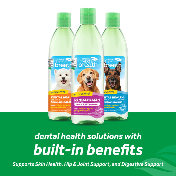 TropiClean Fresh Breath Oral Care Water Additive Plus Hip & Joint For Pets (473ml bottle). Oral care is about more than making your pets’ smiles sparkle—it’s an important component of their overall health. In fact, 80% of dogs and 70% of cats begin to show signs of oral disease by age 3. With TropiClean Fresh Breath Dental Health Solution Plus Hip & Joint, dogs can benefit from daily plaque and tartar defense, simply by drinking from their water bowl. Plus, glucosamine helps promote healthy hips and joints. Easy to use for both you and your dog—no brushing required.